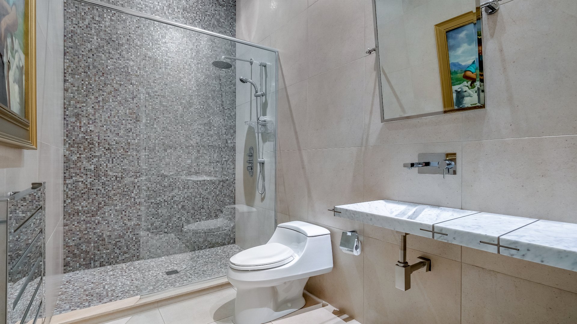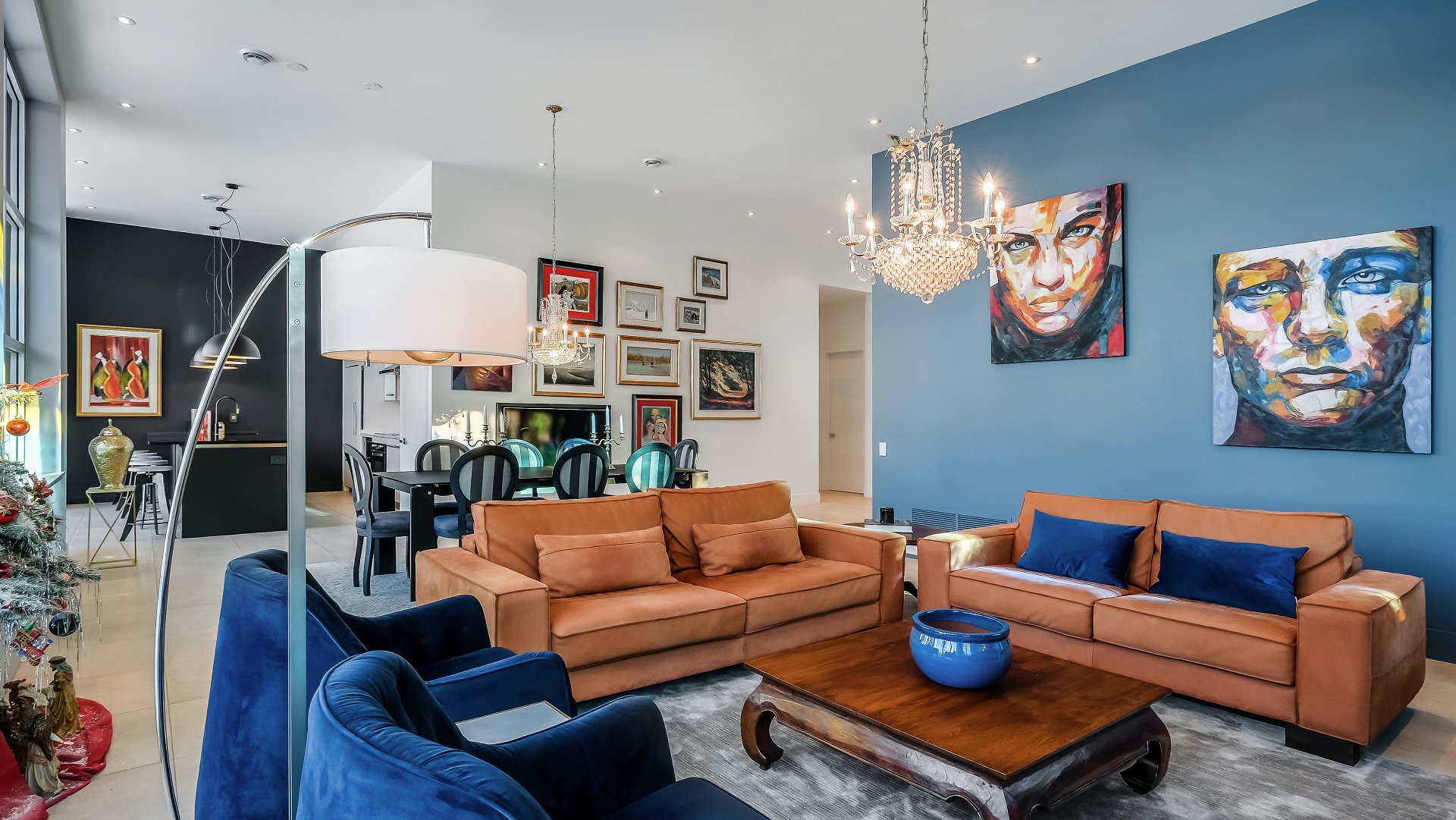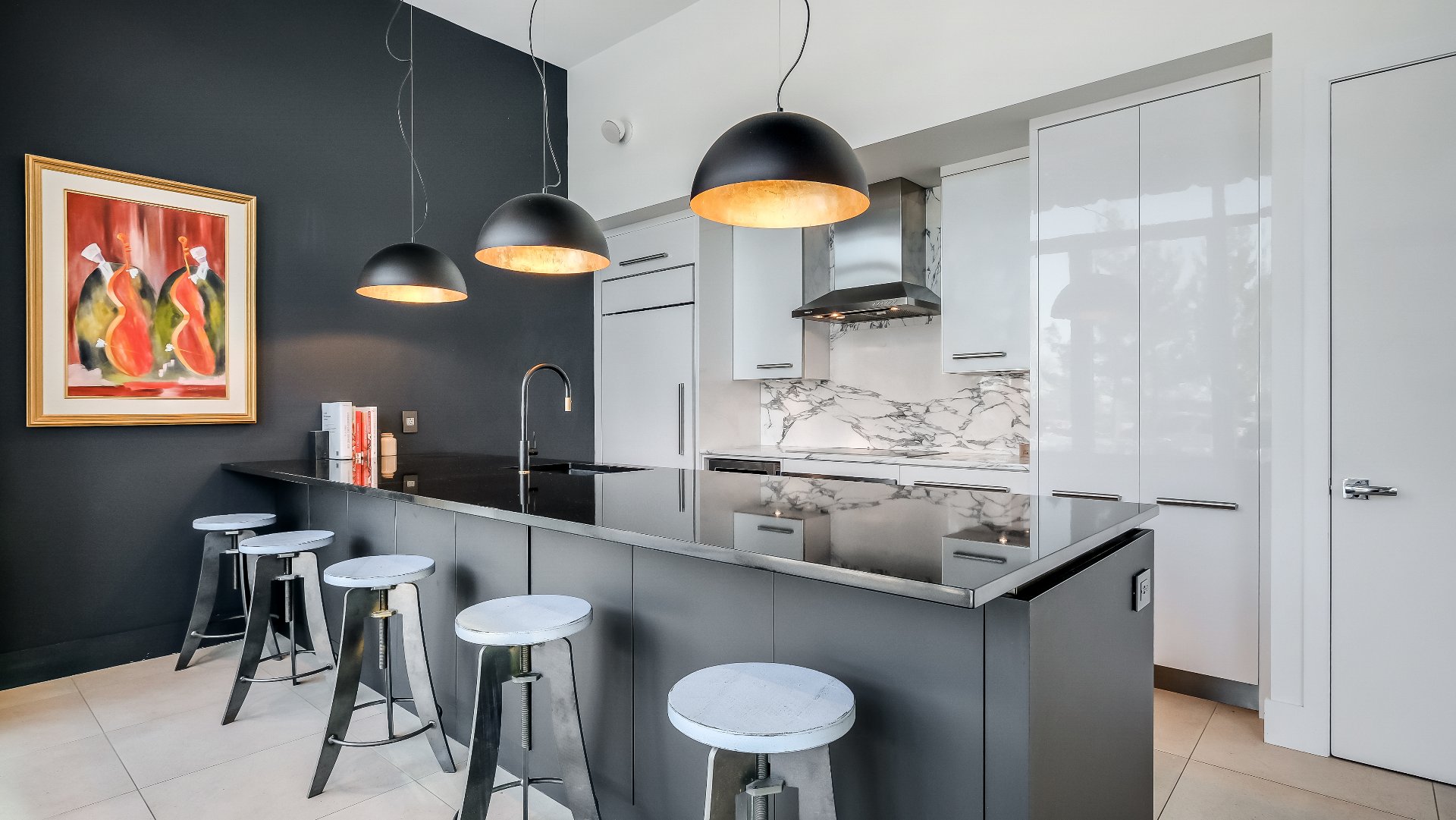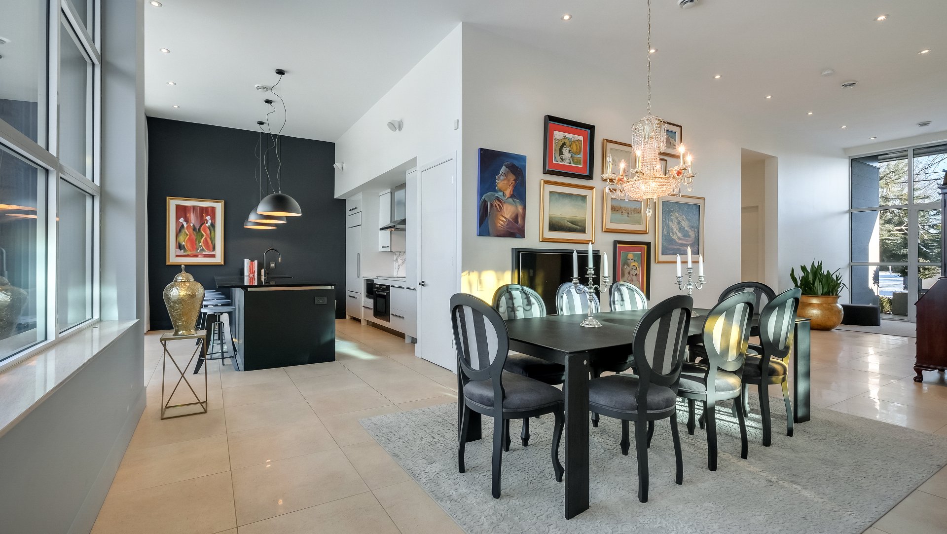 La cuisine, pensée pour les amateurs de design et de gastronomie, met en valeur un îlot de 12 pieds en quartz et un comptoir de marbre, le tout baigné de lumière grâce à la fenestration triple verre en façade.