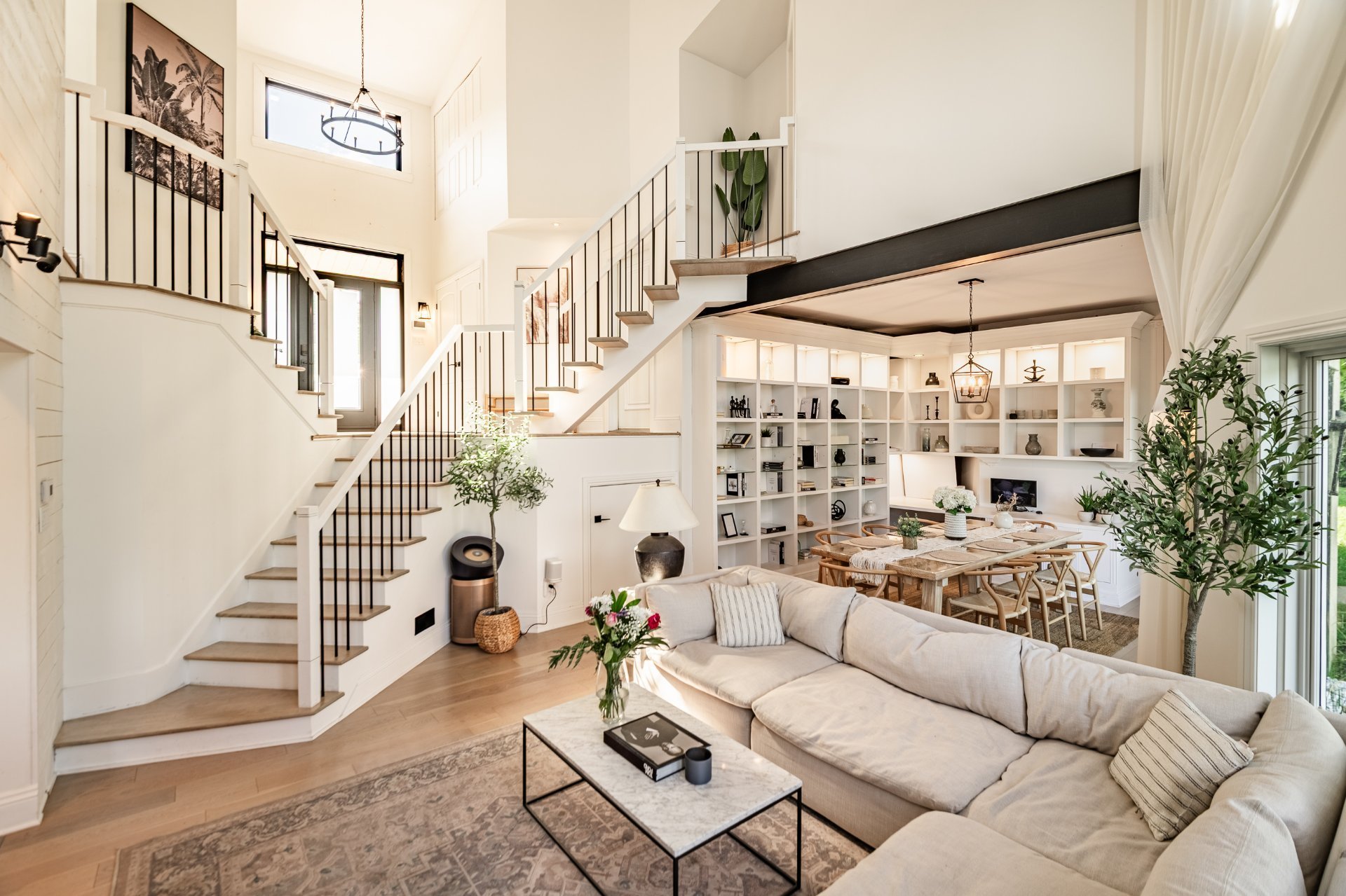 La cuisine moderne, fonctionnelle et élégante, comprend un grand îlot central et un comptoir-lunch pour trois personnes. La salle à manger lumineuse s'ouvre sur un salon à aire ouverte dont les grandes fenêtres prolongent naturellement la pièce vers l'extérieur. L'ensemble offre un espace de vie équilibré, à la fois convivial et harmonieux.