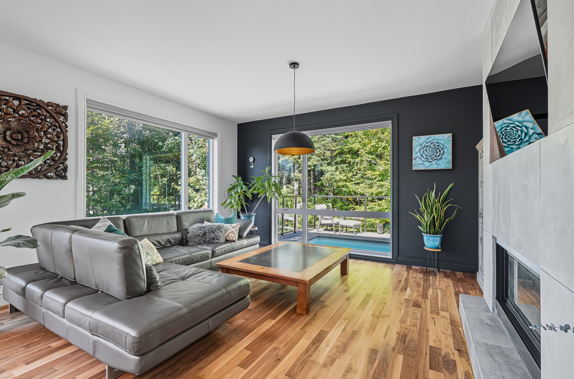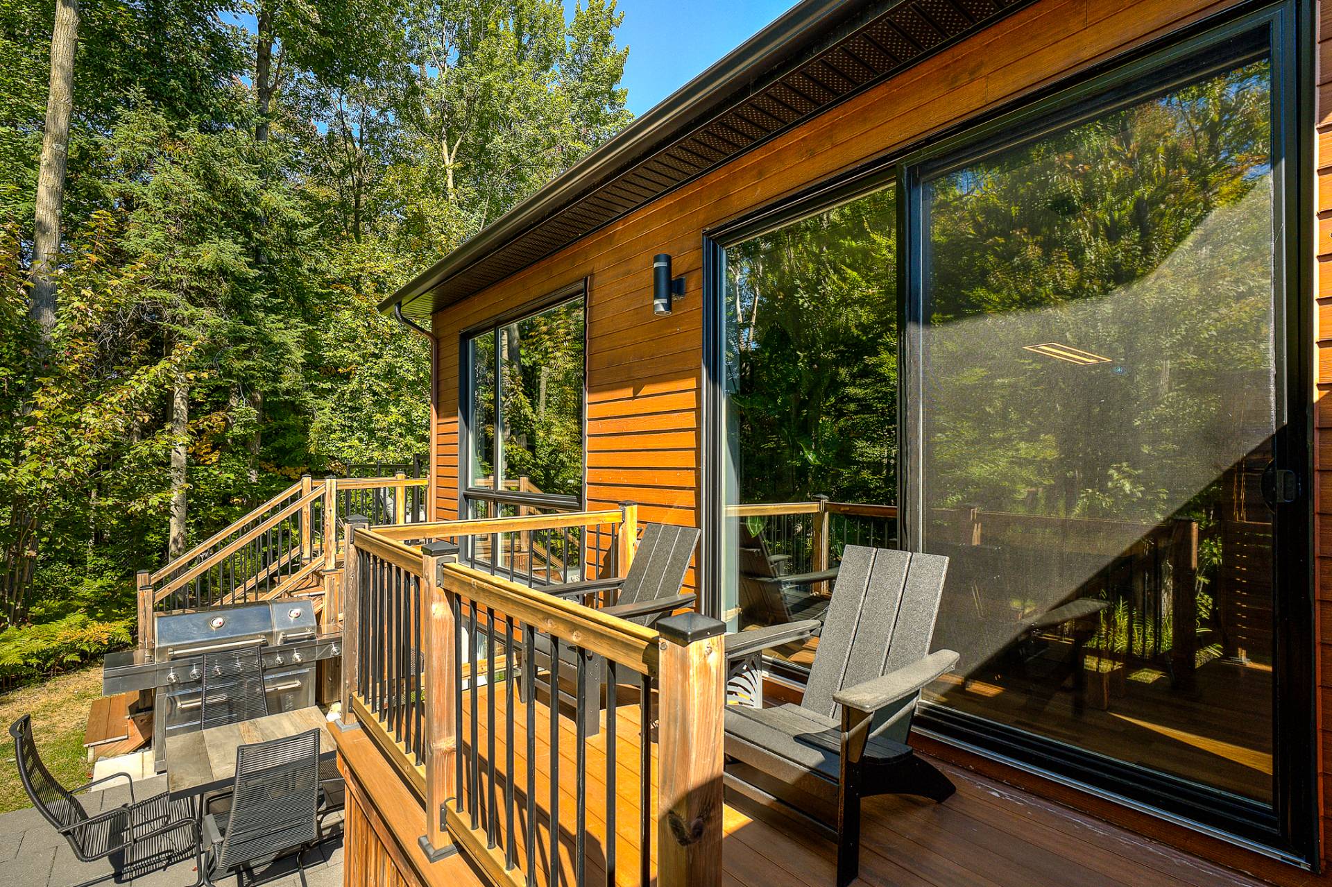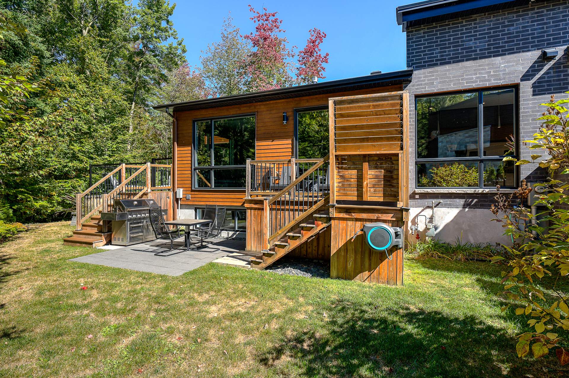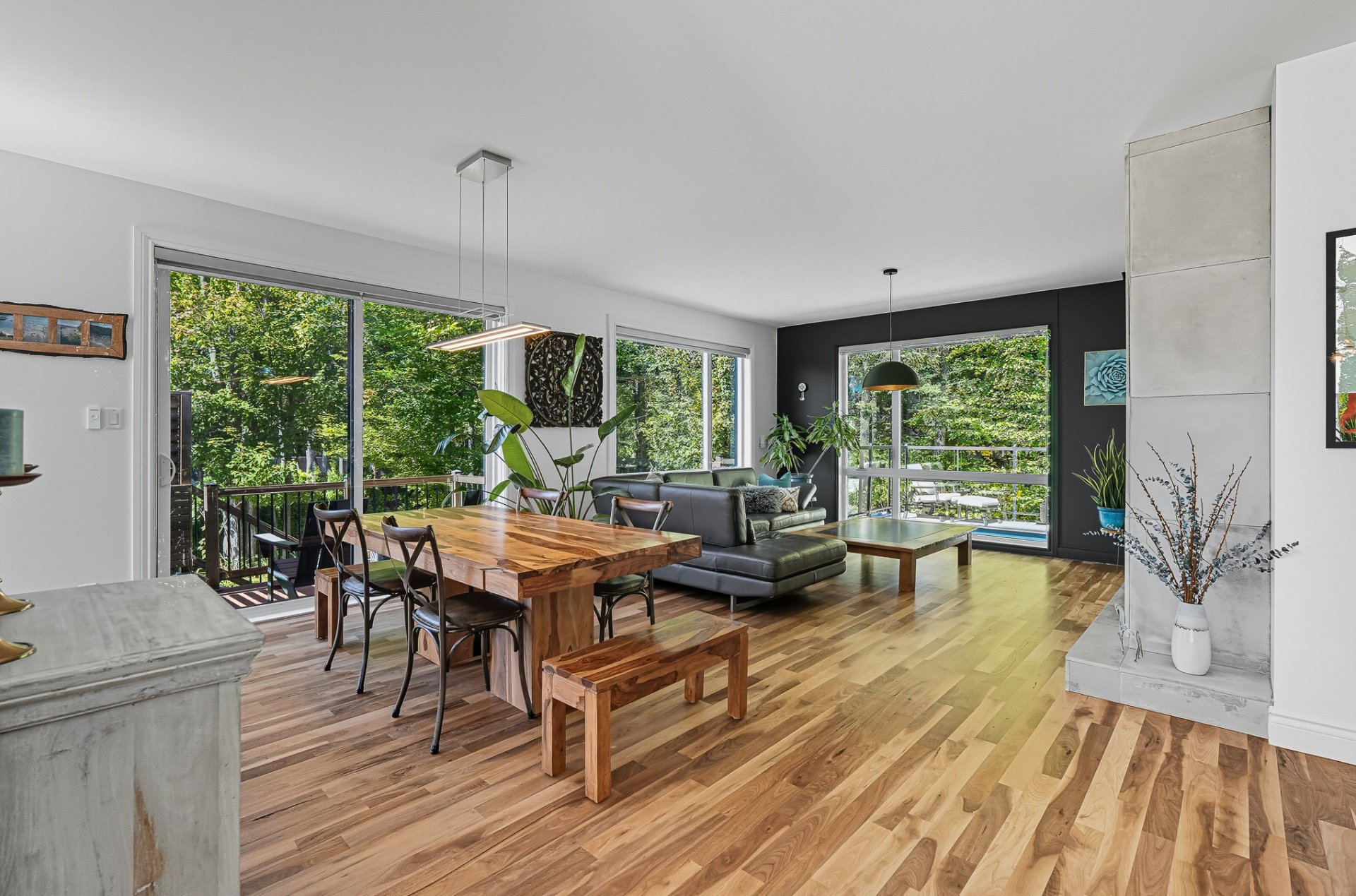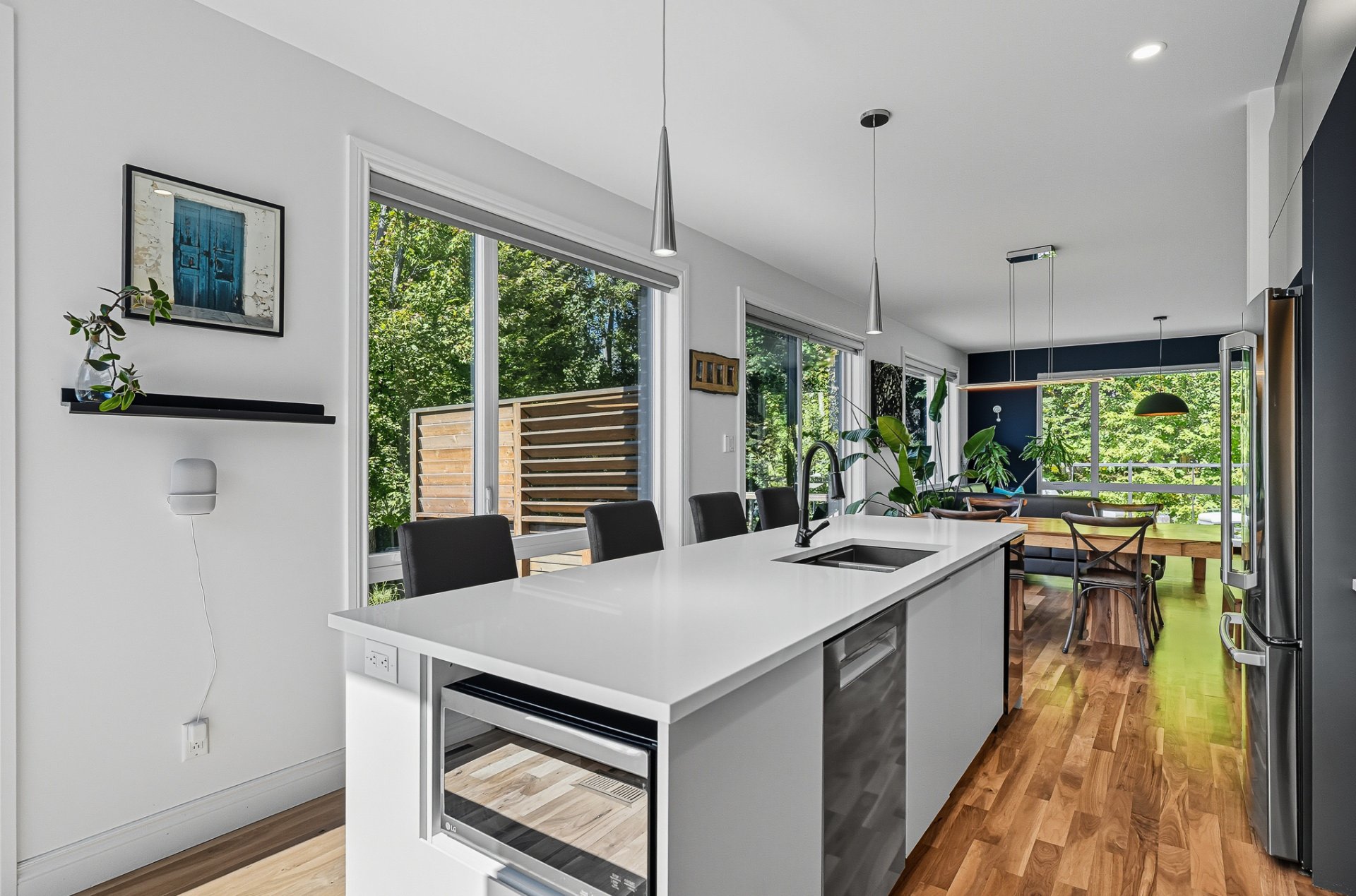 Dès votre entrée, vous serez séduit par l'abondante luminosité naturelle qui traverse les grandes fenêtres, offrant une vue panoramique sur la nature environnante. Les planchers exotiques, d'une richesse et d'un raffinement remarquables, ajoutent une touche distinctive à l'ensemble. Le rez-de-chaussée propose deux chambres à coucher, une salle de bain complète, une salle d'eau avec salle de lavage intégrée et une superbe cuisine au design raffiné, ouverte sur un salon chaleureux avec foyer au gaz. La chambre principale s'ouvre directement sur une terrasse intime, idéale pour profiter des soirées paisibles.
