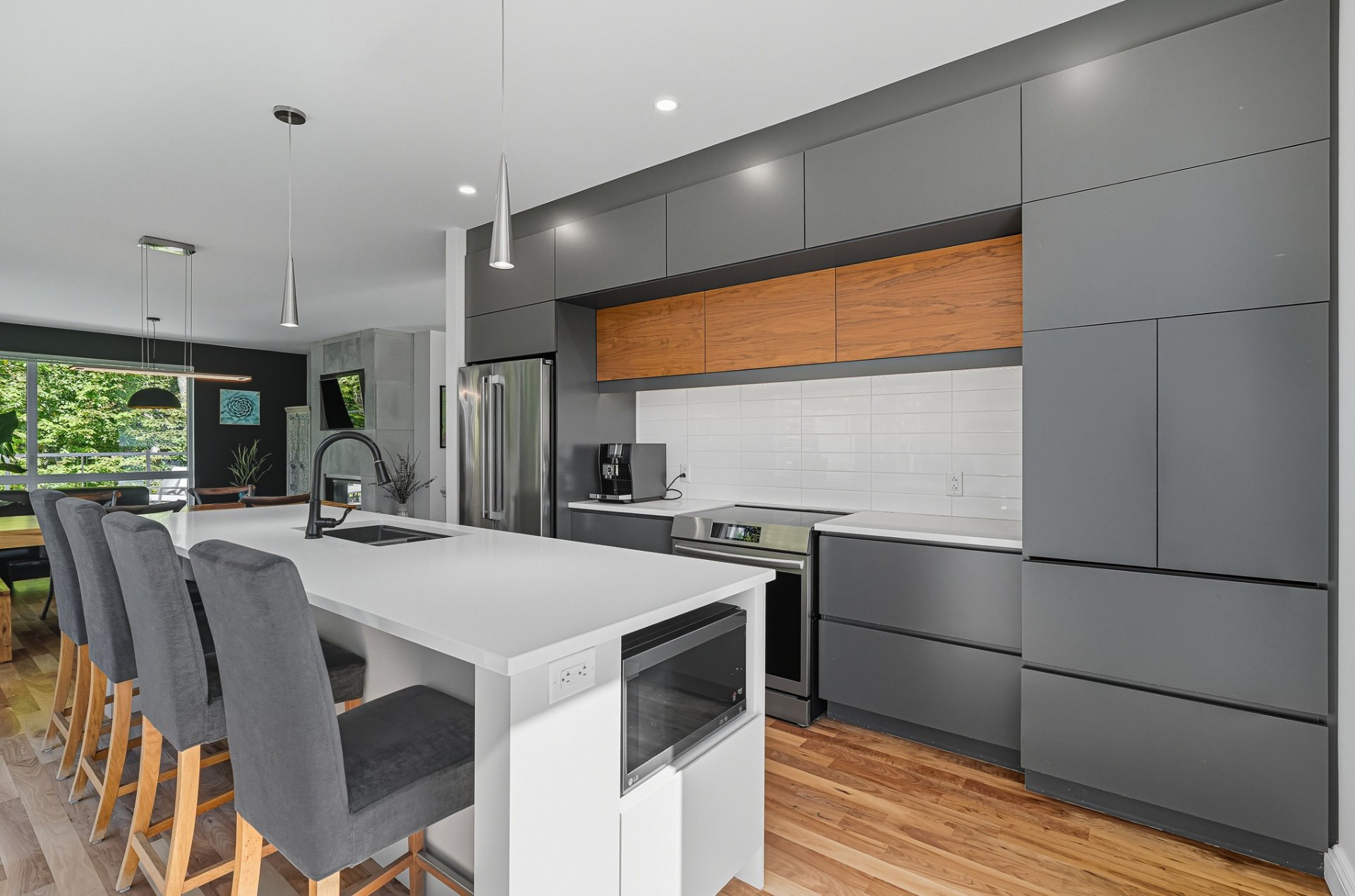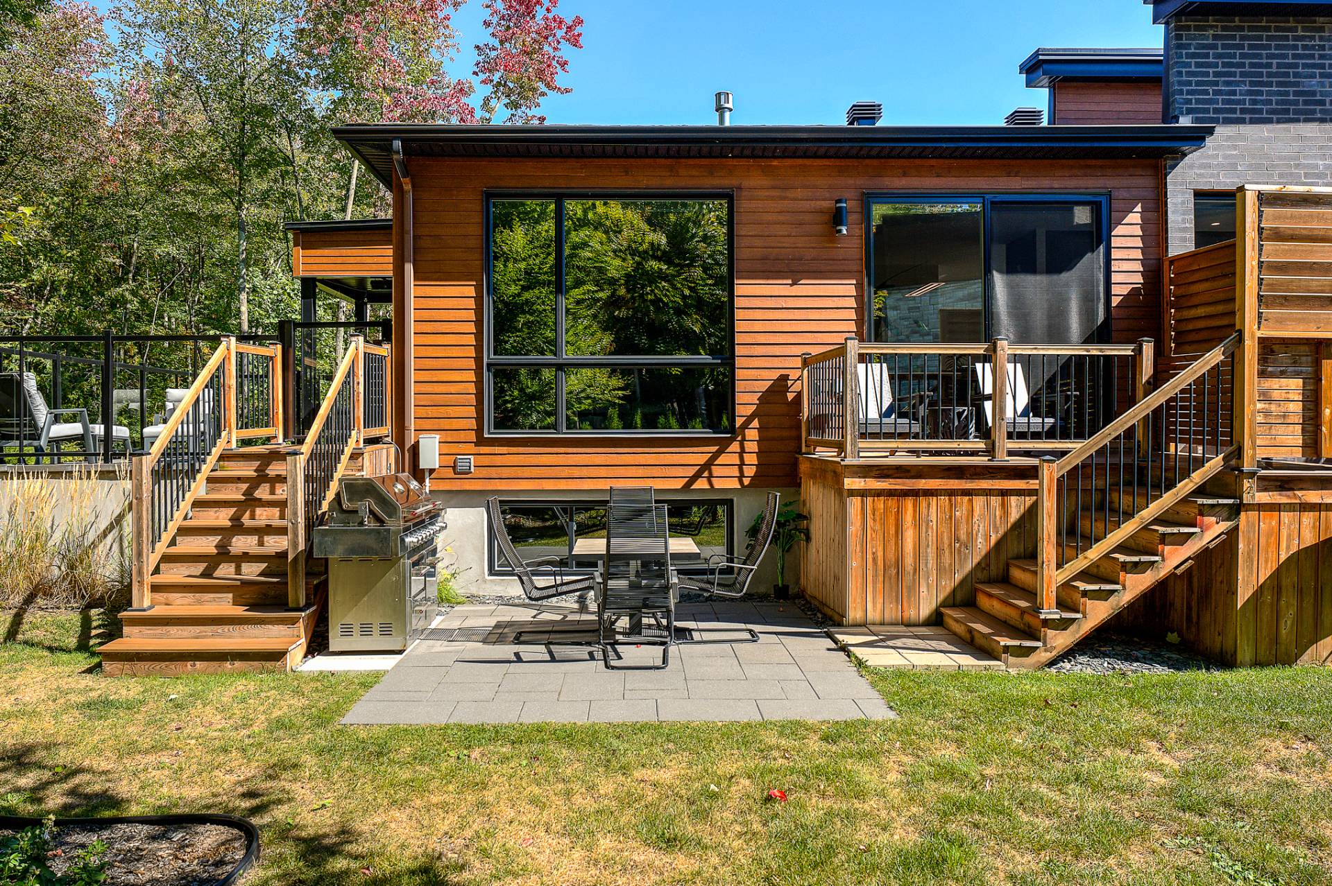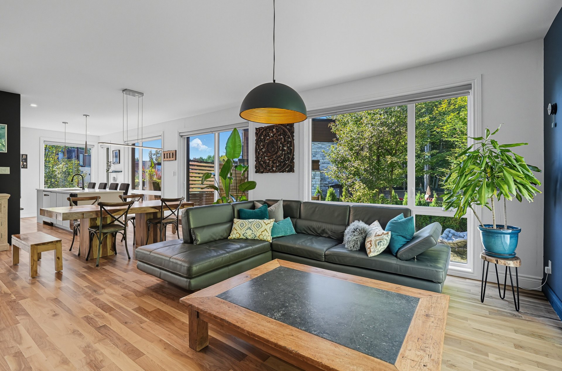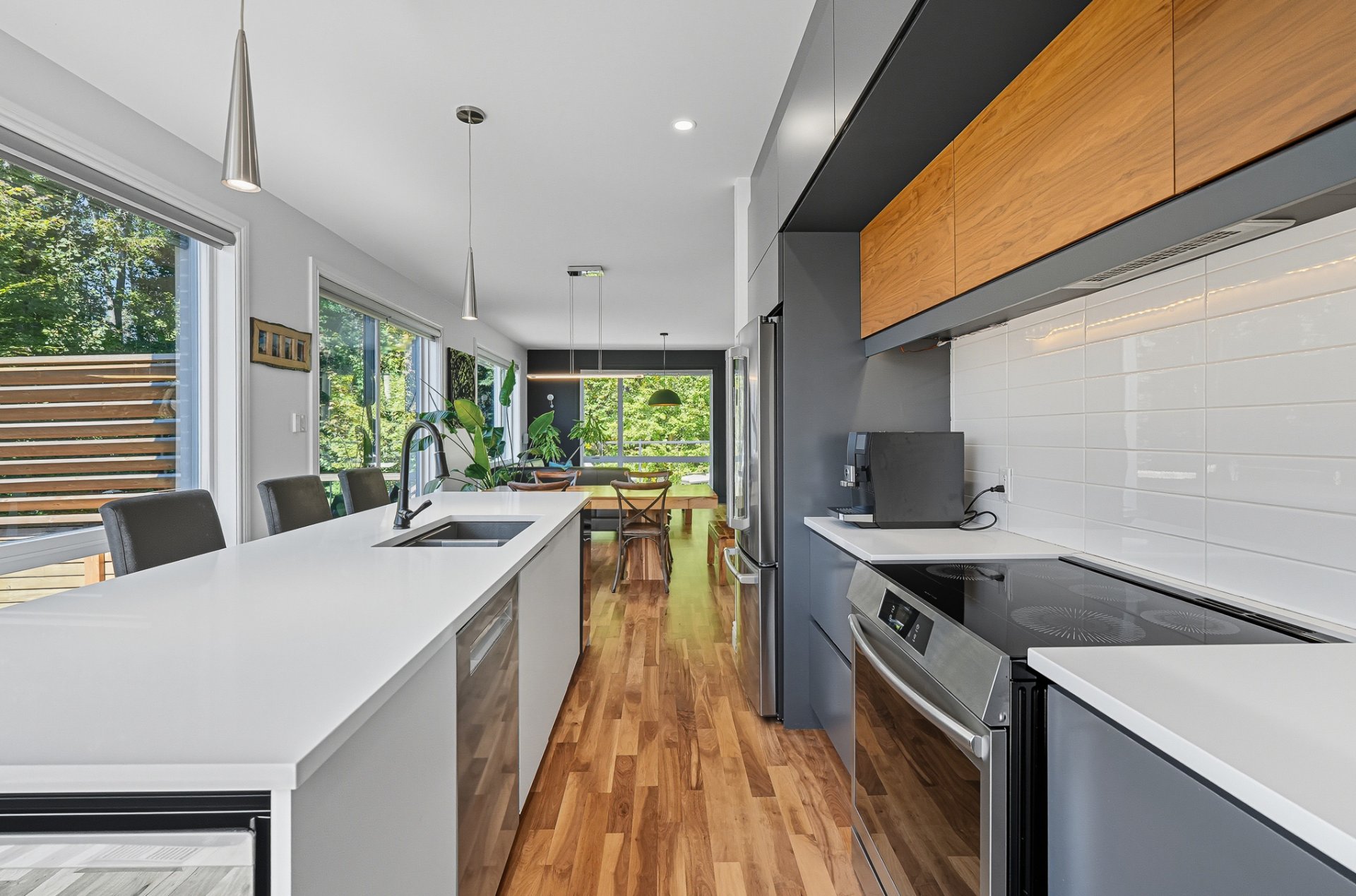 Dès votre entrée, vous serez séduit par l'abondante luminosité naturelle qui traverse les grandes fenêtres, offrant une vue panoramique sur la nature environnante. Les planchers exotiques, d'une richesse et d'un raffinement remarquables, ajoutent une touche distinctive à l'ensemble. Le rez-de-chaussée propose deux chambres à coucher, une salle de bain complète, une salle d'eau avec salle de lavage intégrée et une superbe cuisine au design raffiné, ouverte sur un salon chaleureux avec foyer au gaz. La chambre principale s'ouvre directement sur une terrasse intime, idéale pour profiter des soirées paisibles.