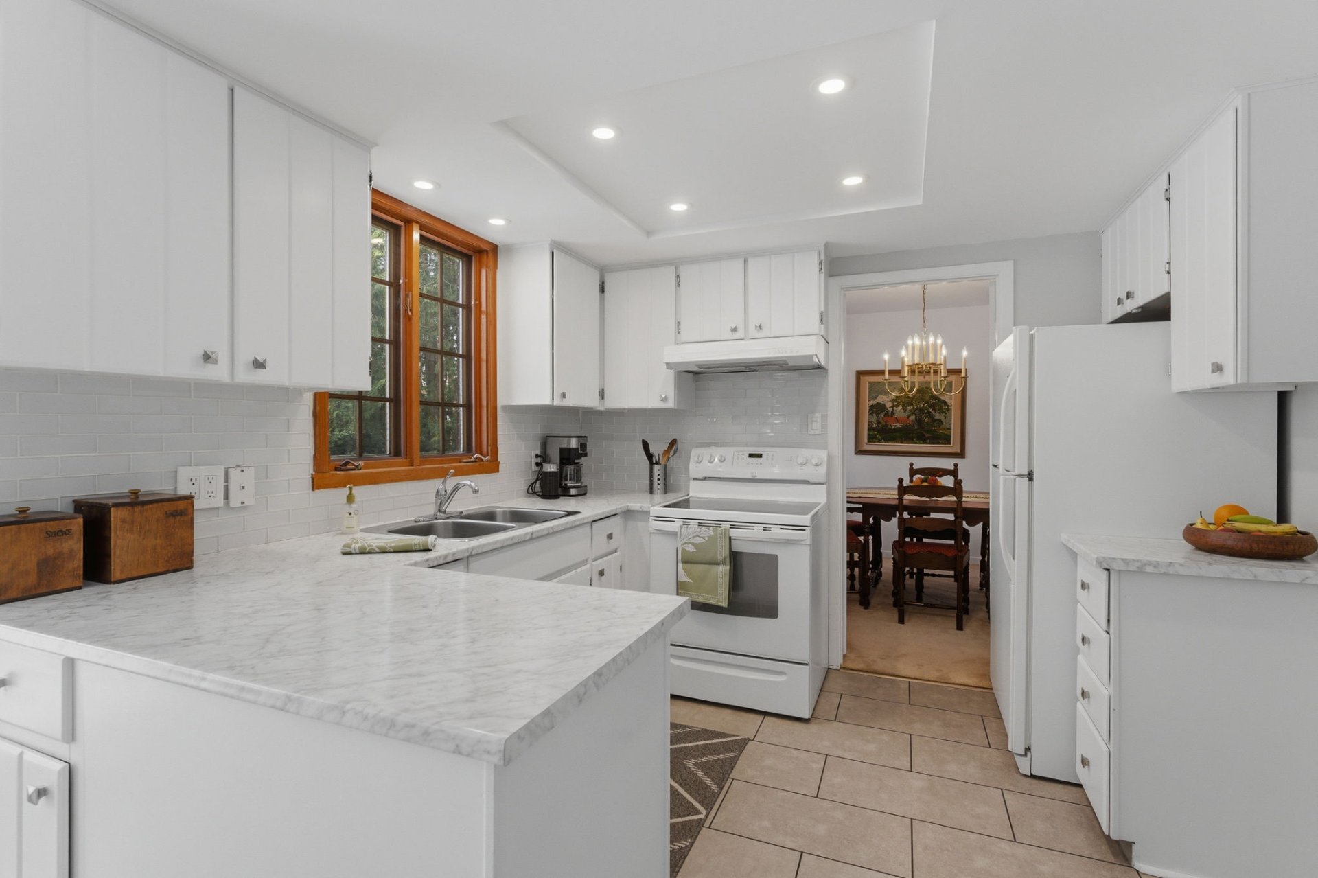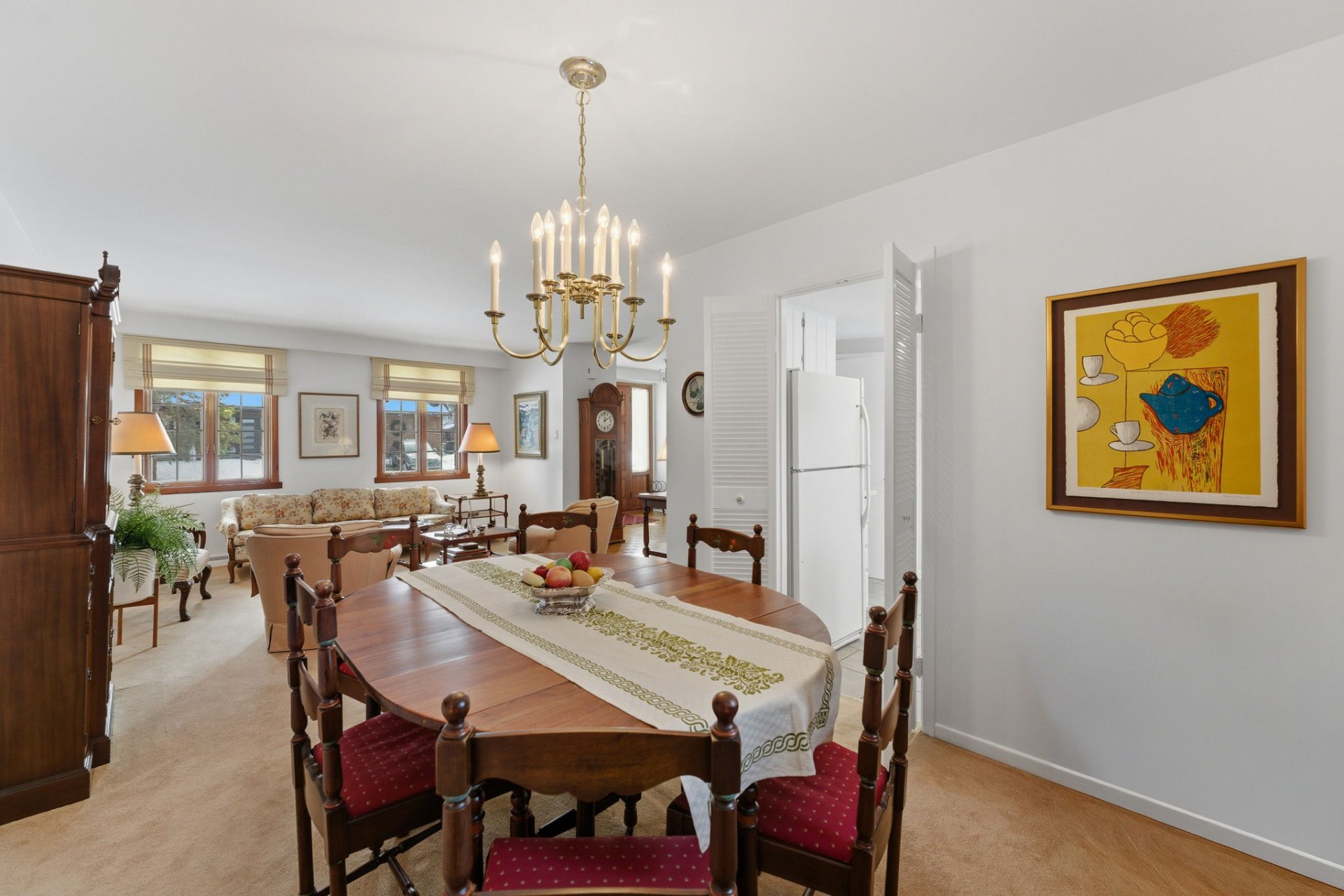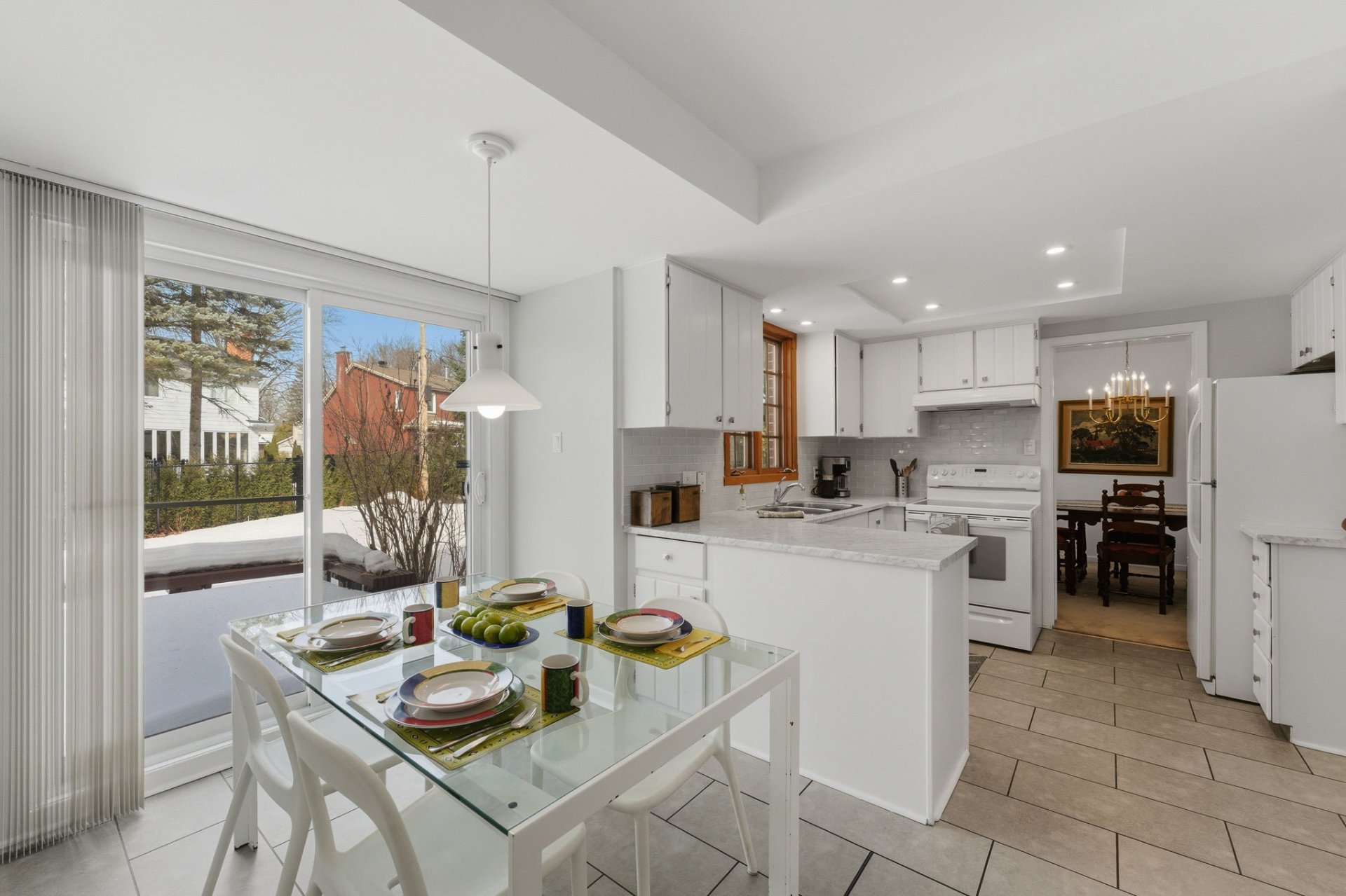 - Cuisinière, laveuse, sécheuse, luminaire suspendu dans la salle-à-manger.
