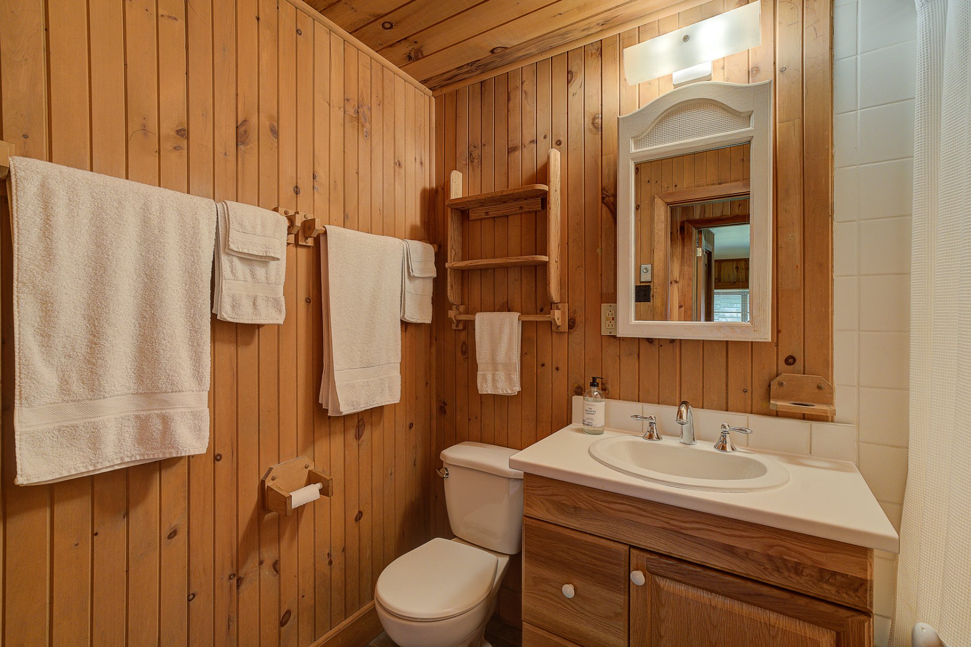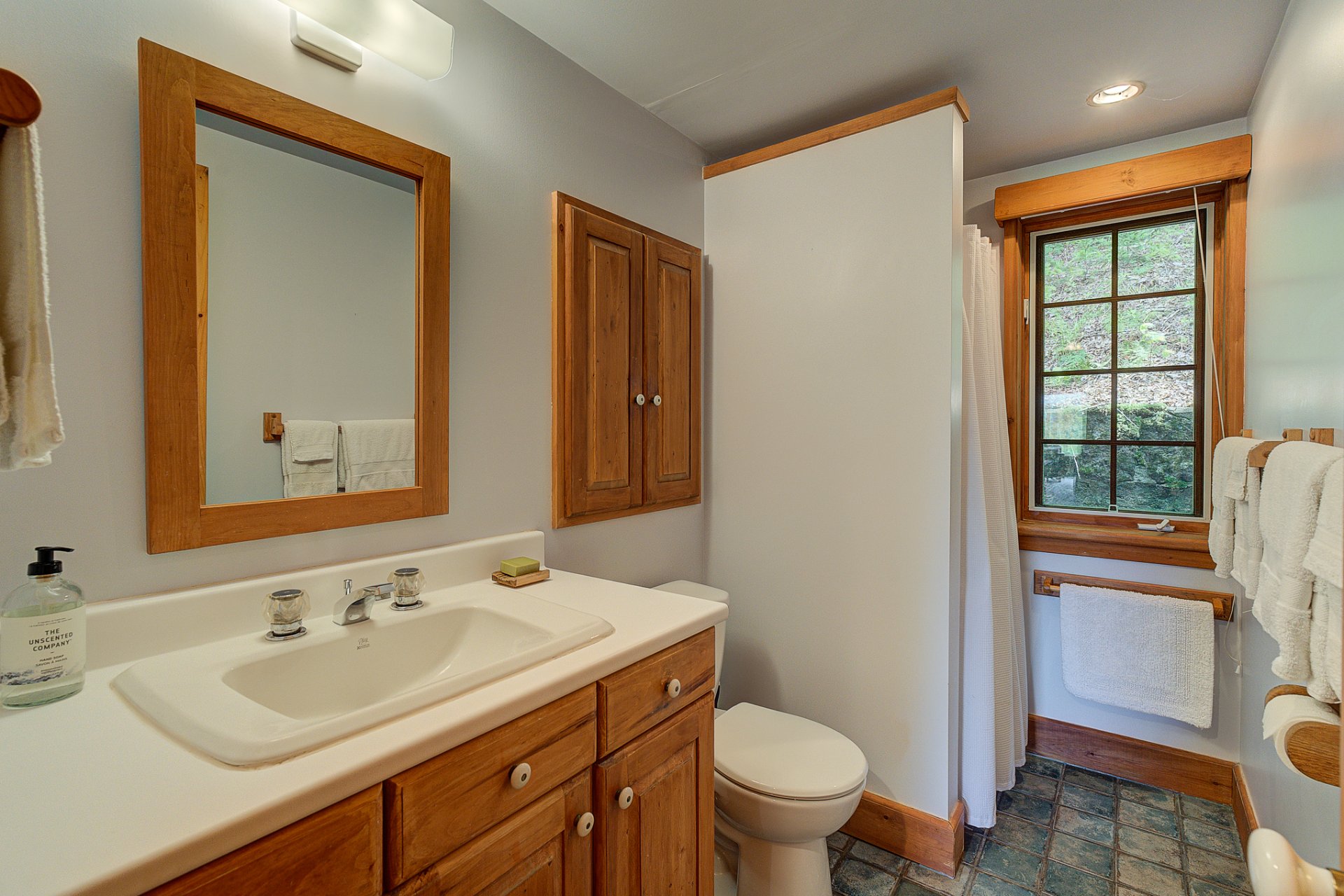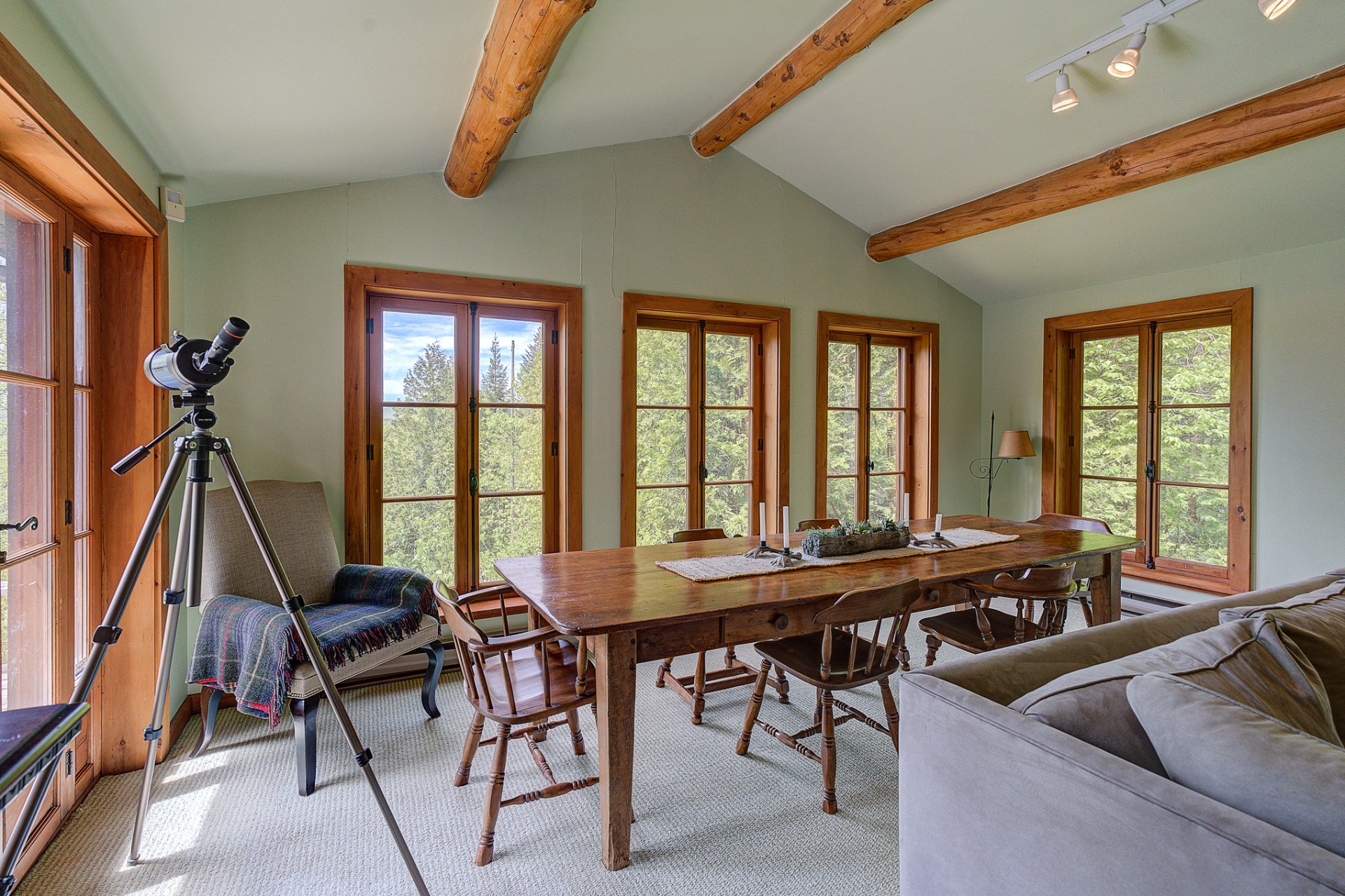 La propriété comprend trois chambres, deux salles de bains, une jolie cuisine au style champêtre, ainsi qu'un mudroom pratique pour faciliter les retours de plein air. Une grande salle familiale lumineuse, dotée d'une salle à manger, offre un espace de vie supplémentaire pour recevoir, se détendre ou profiter de la vue sur la nature environnante.