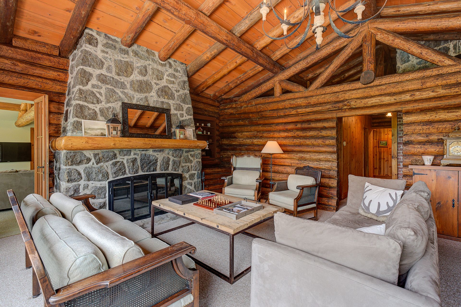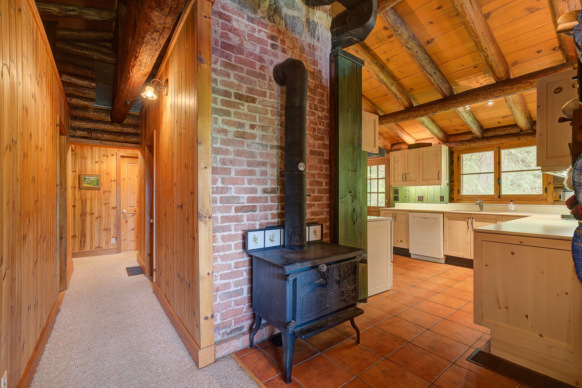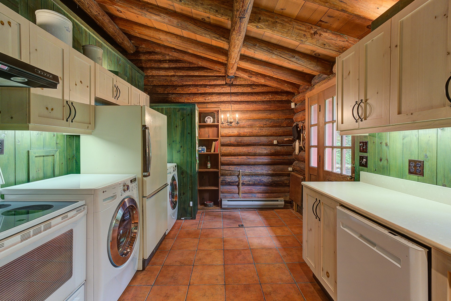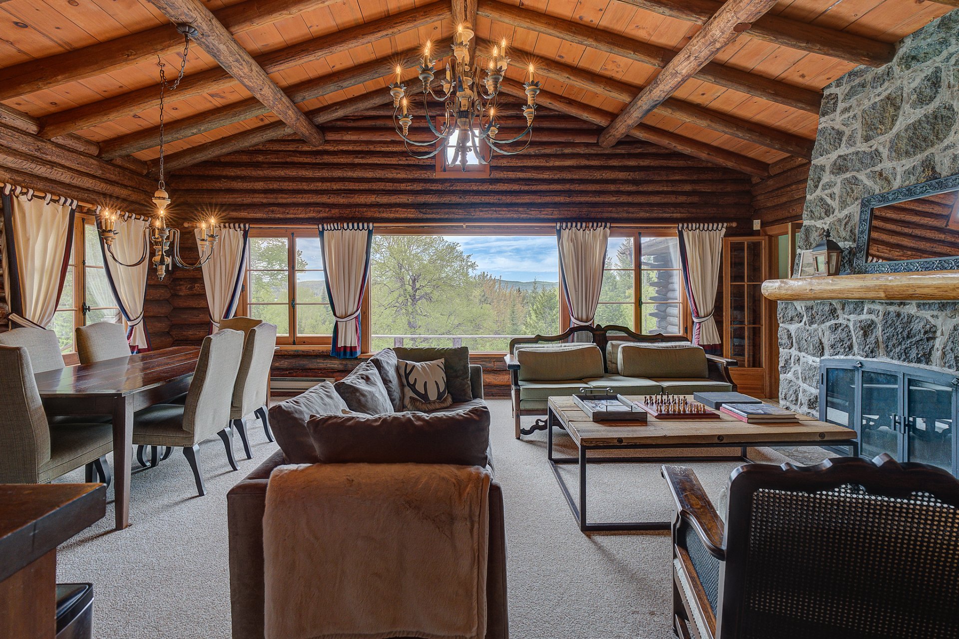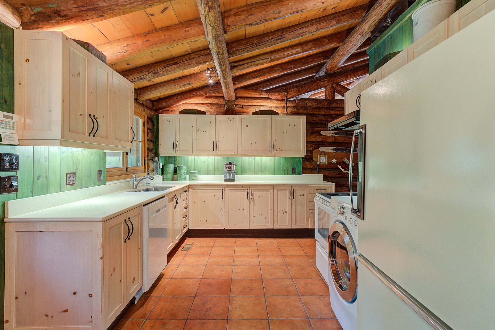 L'intérieur dégage une ambiance chaleureuse et authentique, avec ses poutres apparentes, ses murs en rondins et son superbe foyer au bois en pierre au salon. Un poêle au bois vient compléter cette atmosphère invitante.