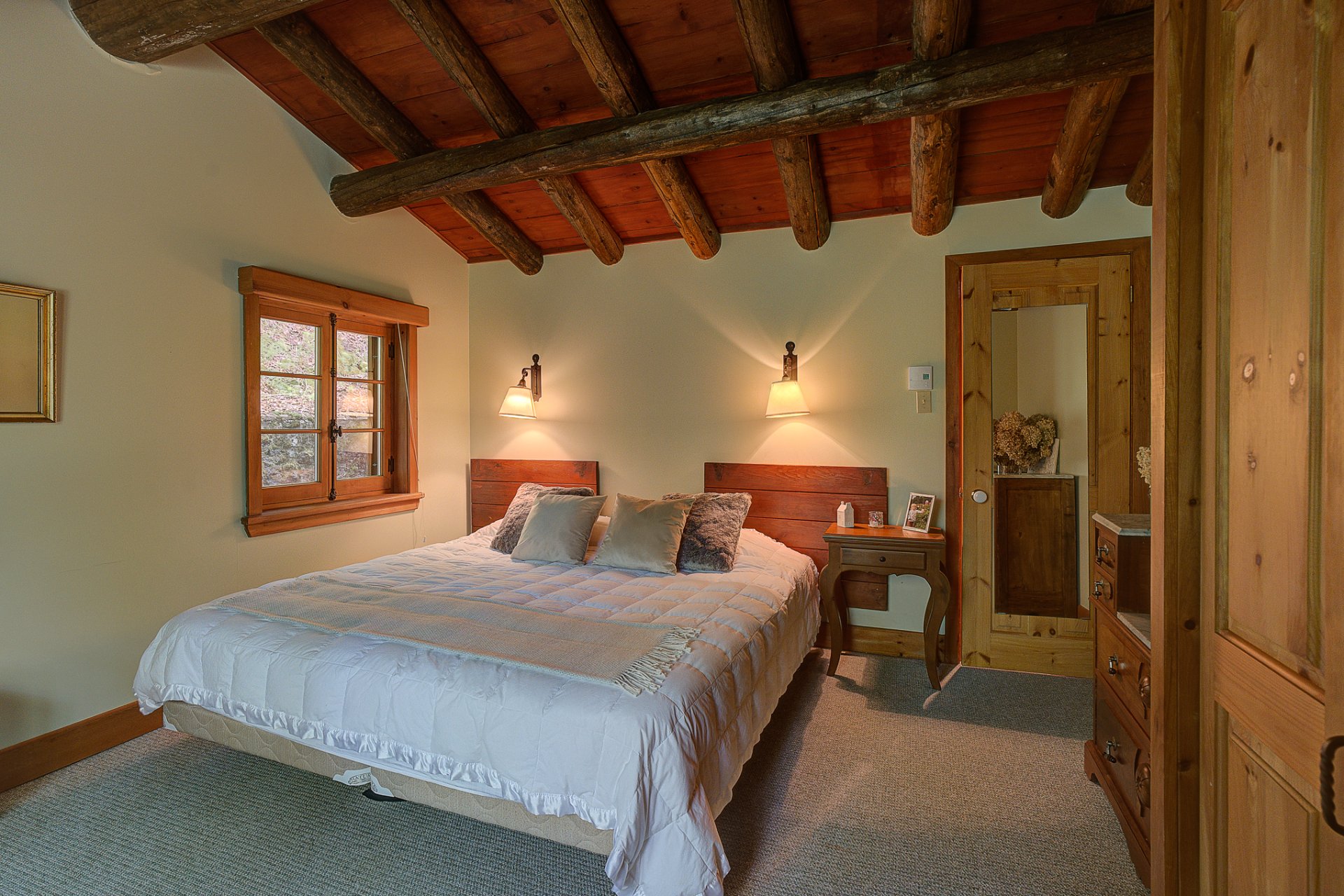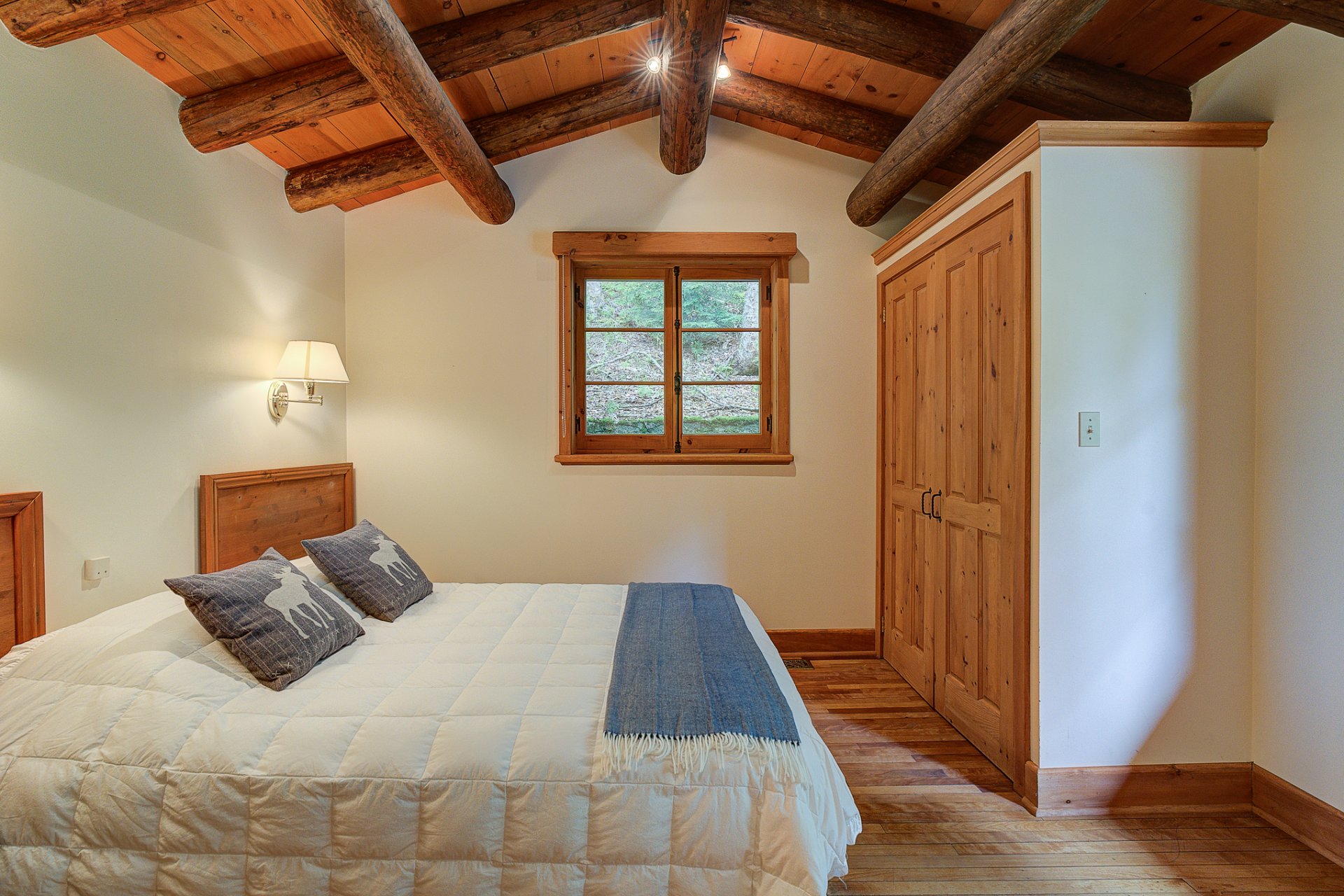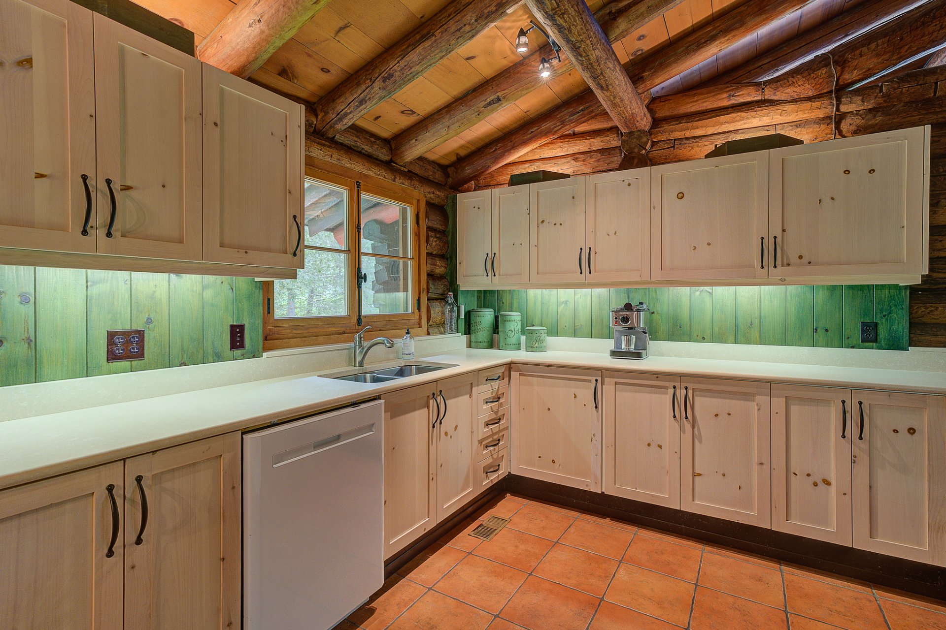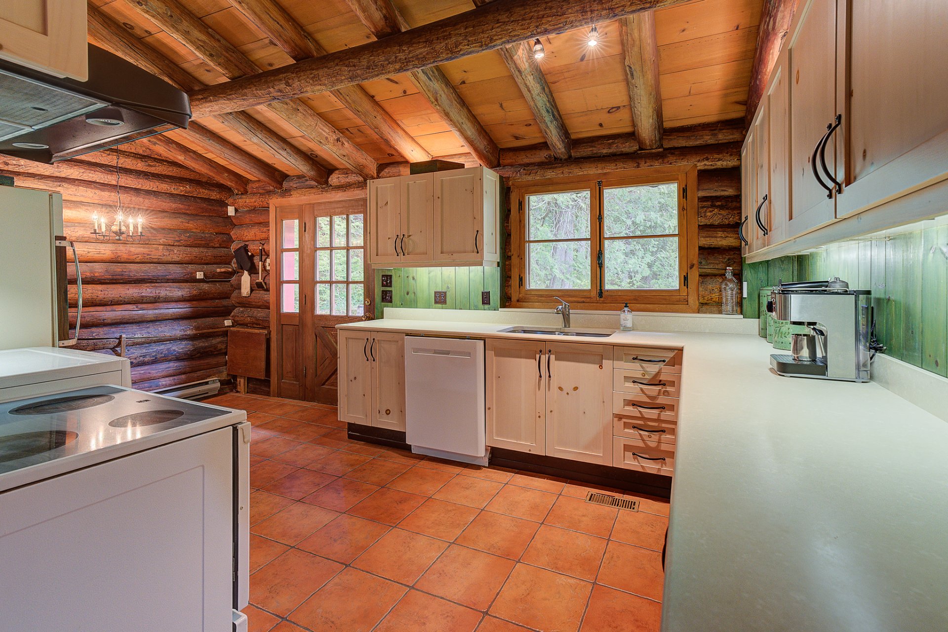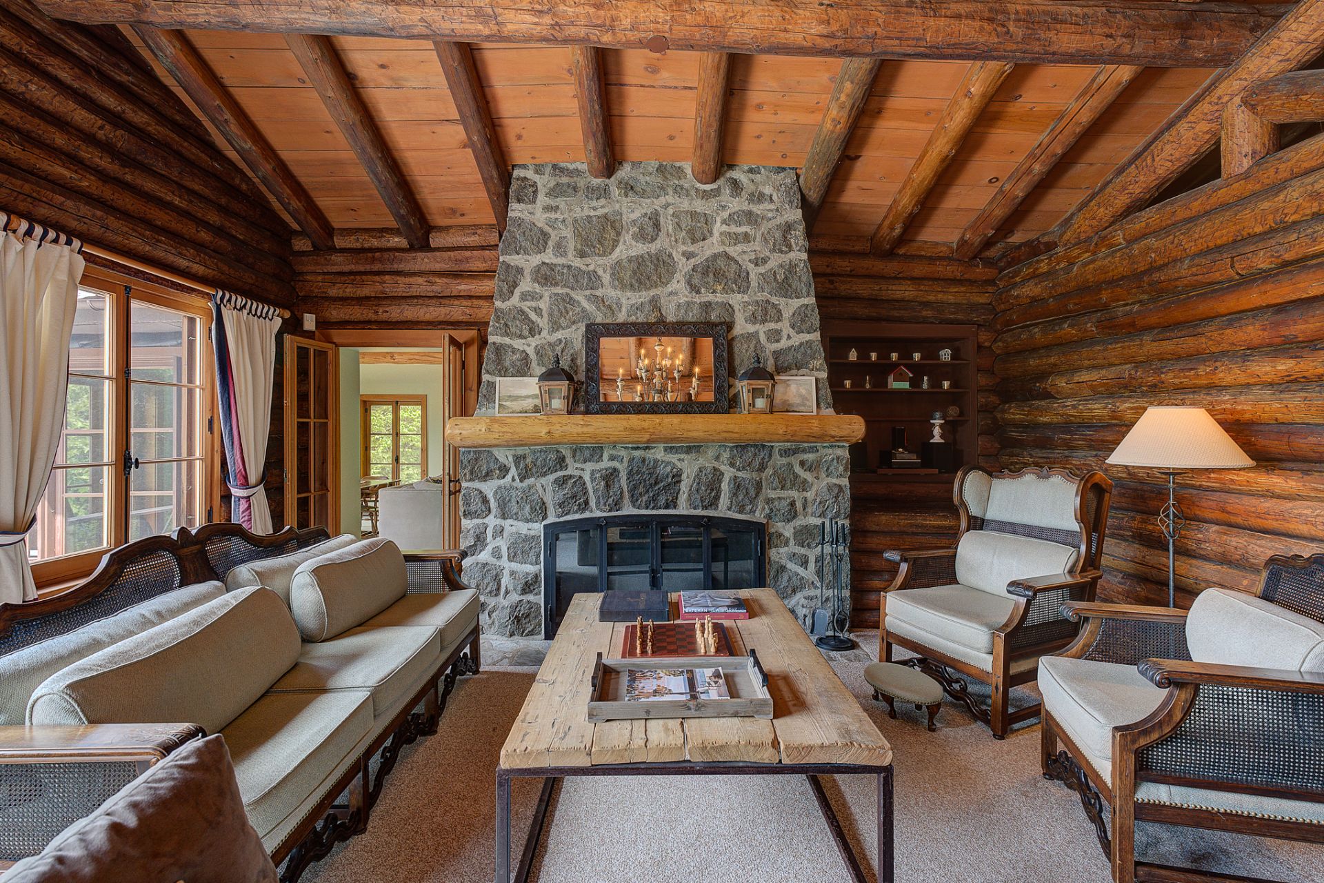 L'intérieur dégage une ambiance chaleureuse et authentique, avec ses poutres apparentes, ses murs en rondins et son superbe foyer au bois en pierre au salon. Un poêle au bois vient compléter cette atmosphère invitante.
