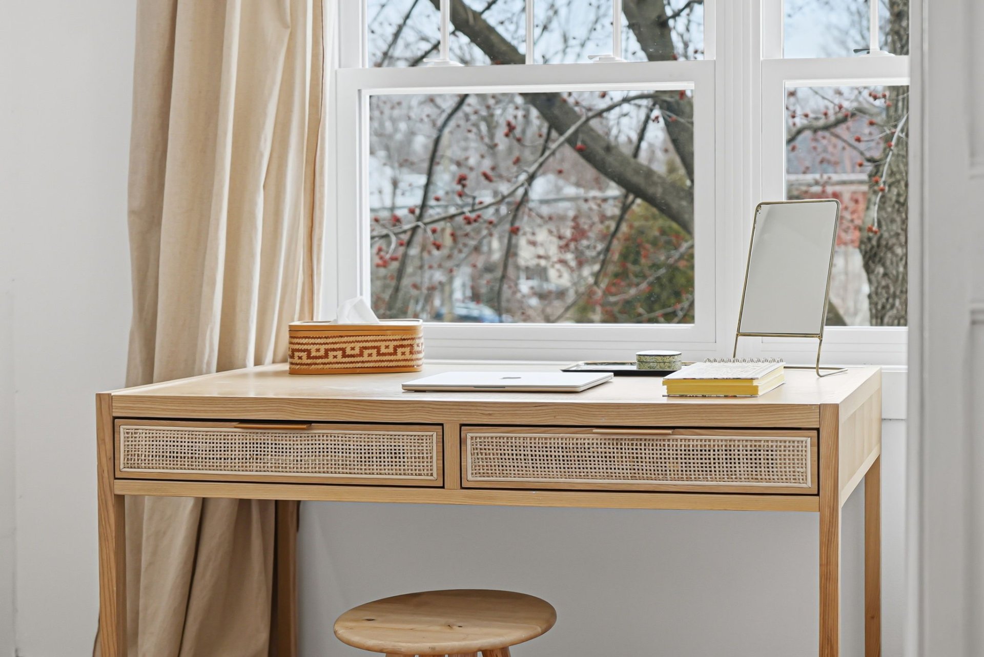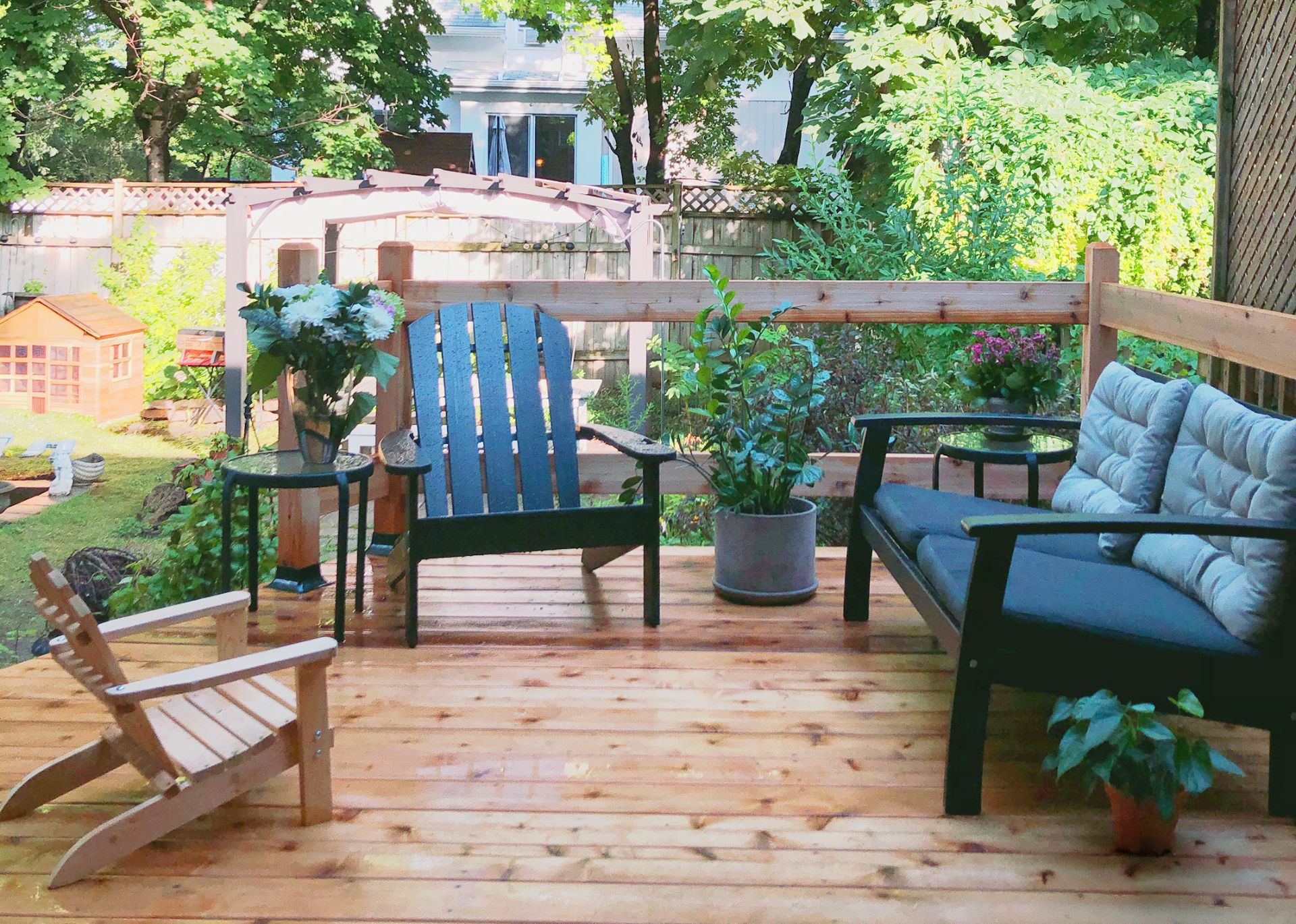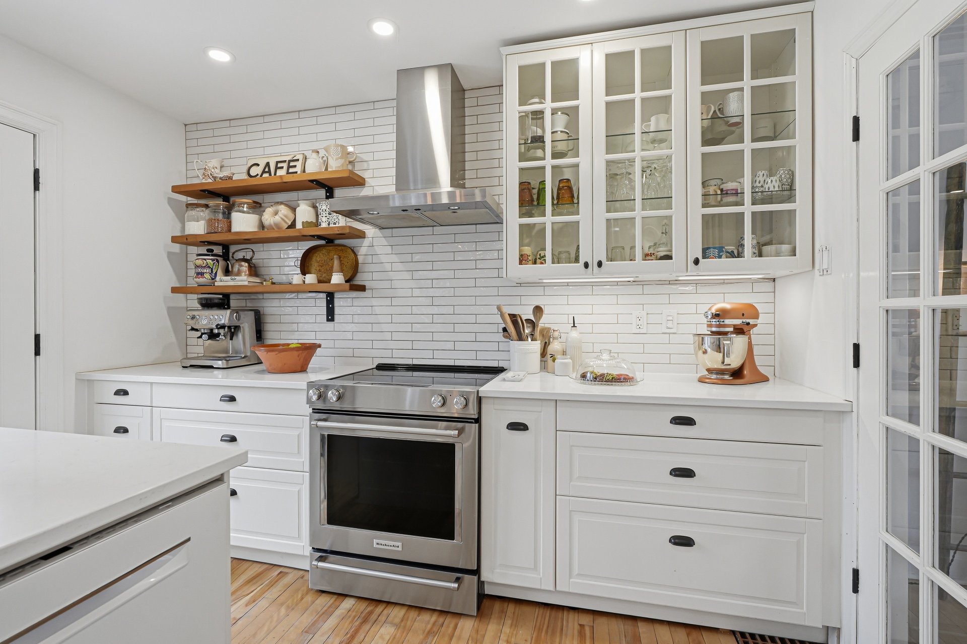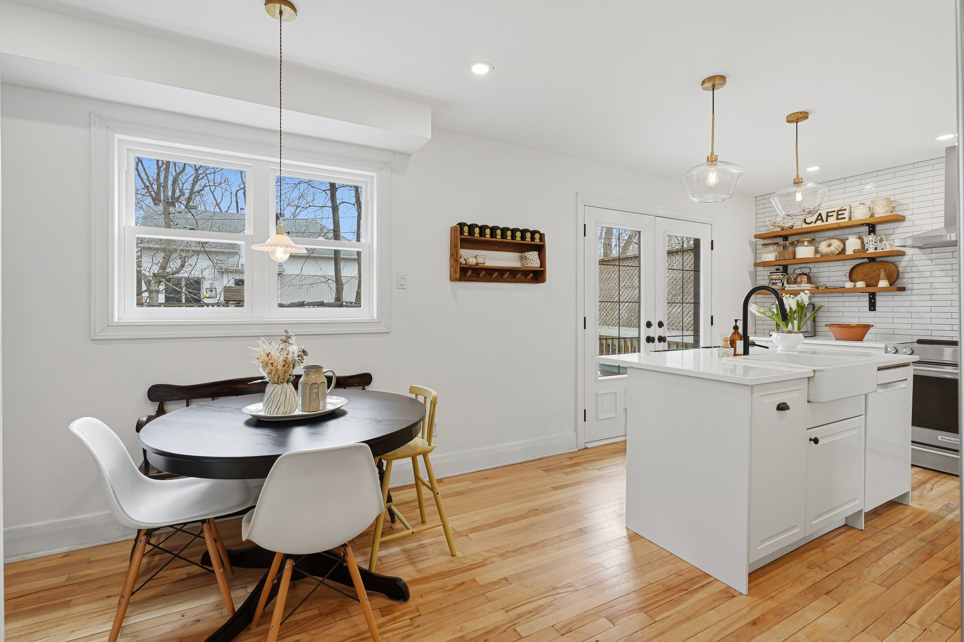 - Lave-vaisselle, hotte, laveuse, sécheuse, luminaires suspendus de l'îlot de cuisine, tringles et habillages de fenêtres (rideaux et persiennes), miroirs des salles de bain, étagères murales en bois à gauche de la hotte, grande armoire dans la chambre principale, pergola et abri de jardin.
