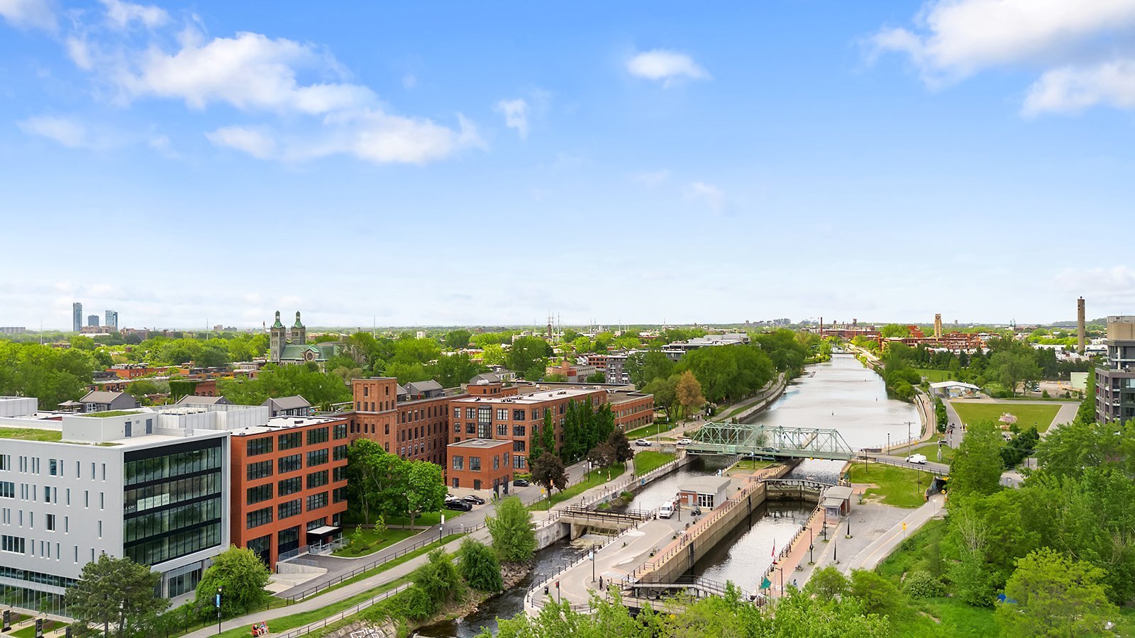 - Grandes fenêtres offrant une vue imprenable sur le canal de Lachine et l'écluse Saint-Gabriel