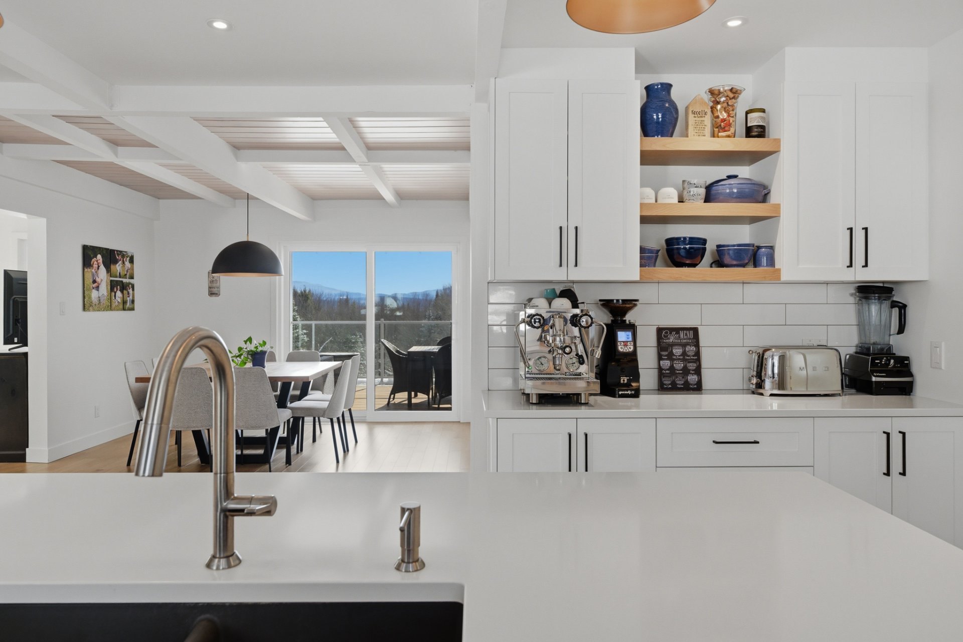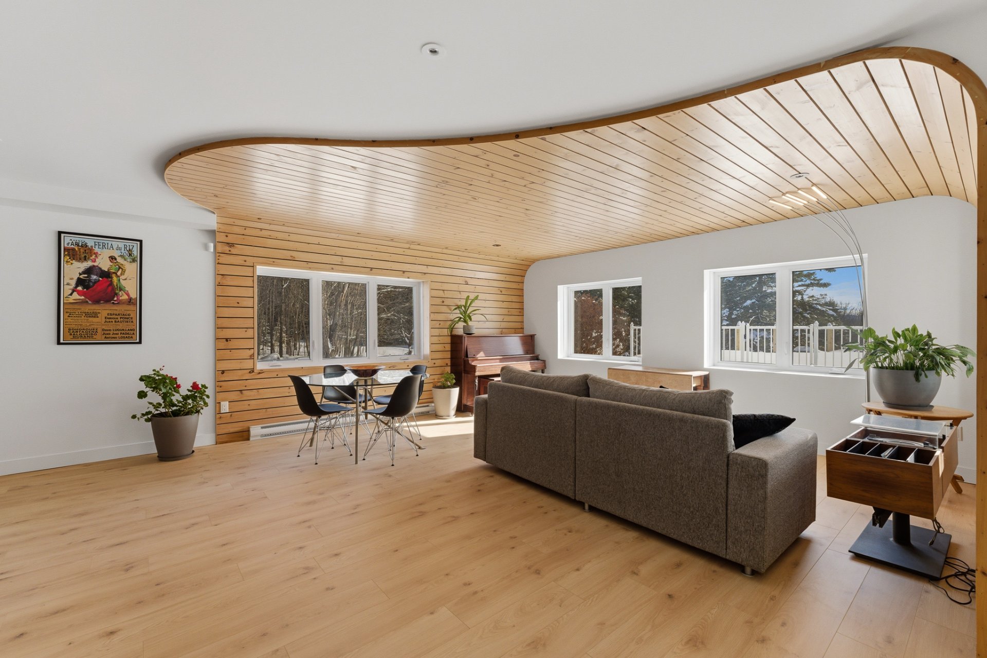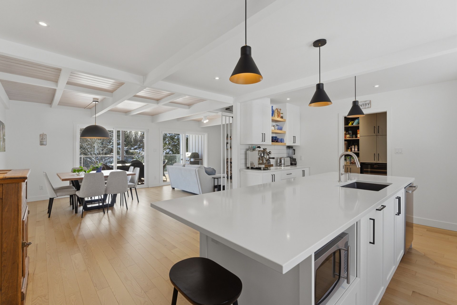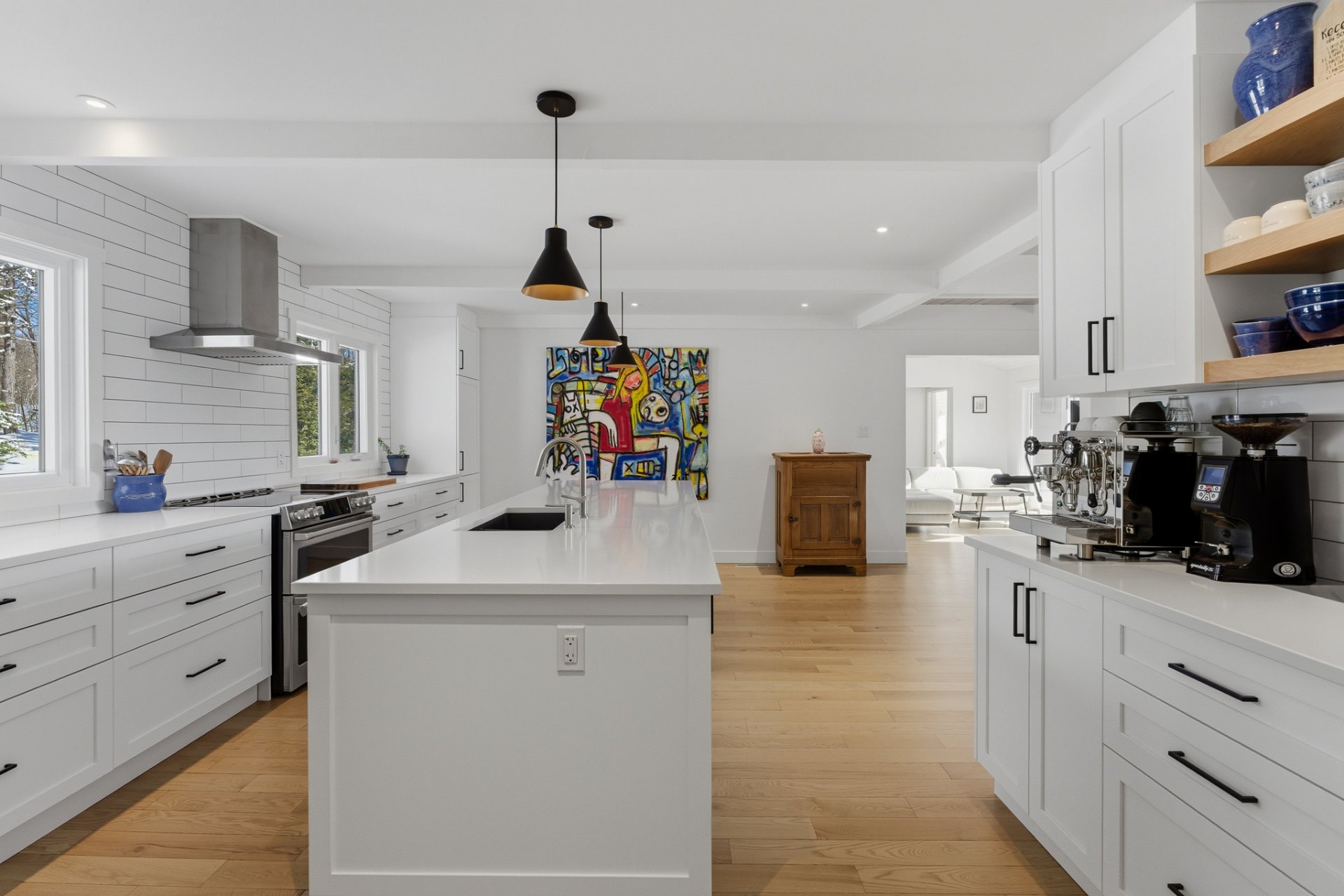 Au coeur de l'aire de vie, la cuisine séduit par son vaste îlot, son coin café et son garde-manger dissimulé avec soin qui offre un accès direct au garage. Ouverte sur la salle à manger et le salon, la lumière abonde, le paysage s'offre comme une oeuvre vivante. Le salon est réchauffé par un foyer au bois pour une ambiance feutrée en hiver tandis que la grande terrasse couverte permet de profiter de l'extérieur dans un cadre enchanteur l'été arrivé.