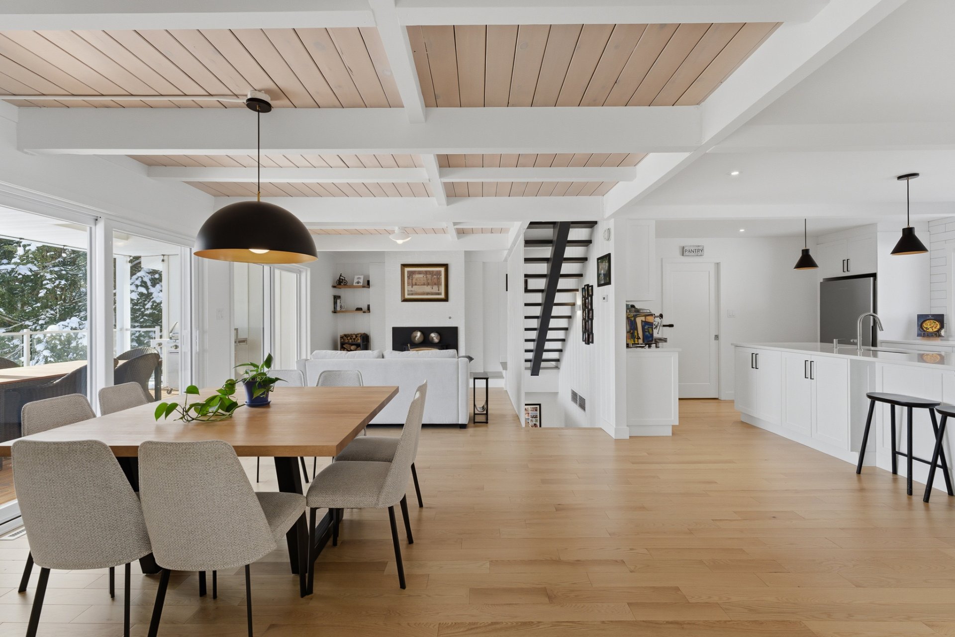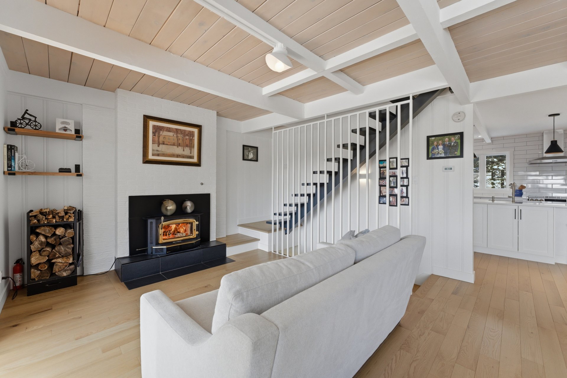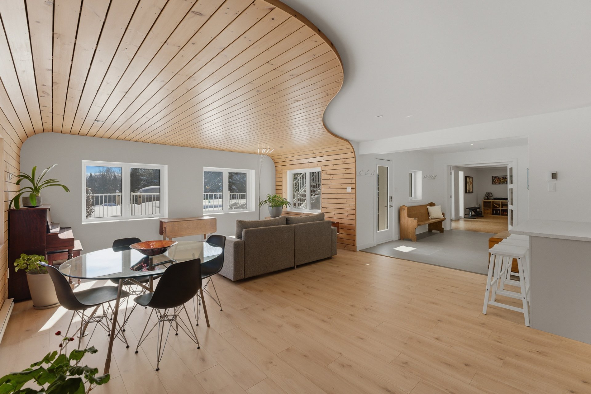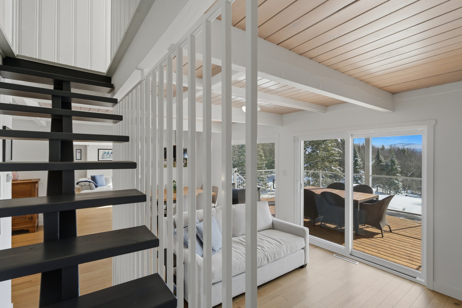 Au coeur de l'aire de vie, la cuisine séduit par son vaste îlot, son coin café et son garde-manger dissimulé avec soin qui offre un accès direct au garage. Ouverte sur la salle à manger et le salon, la lumière abonde, le paysage s'offre comme une oeuvre vivante. Le salon est réchauffé par un foyer au bois pour une ambiance feutrée en hiver tandis que la grande terrasse couverte permet de profiter de l'extérieur dans un cadre enchanteur l'été arrivé.