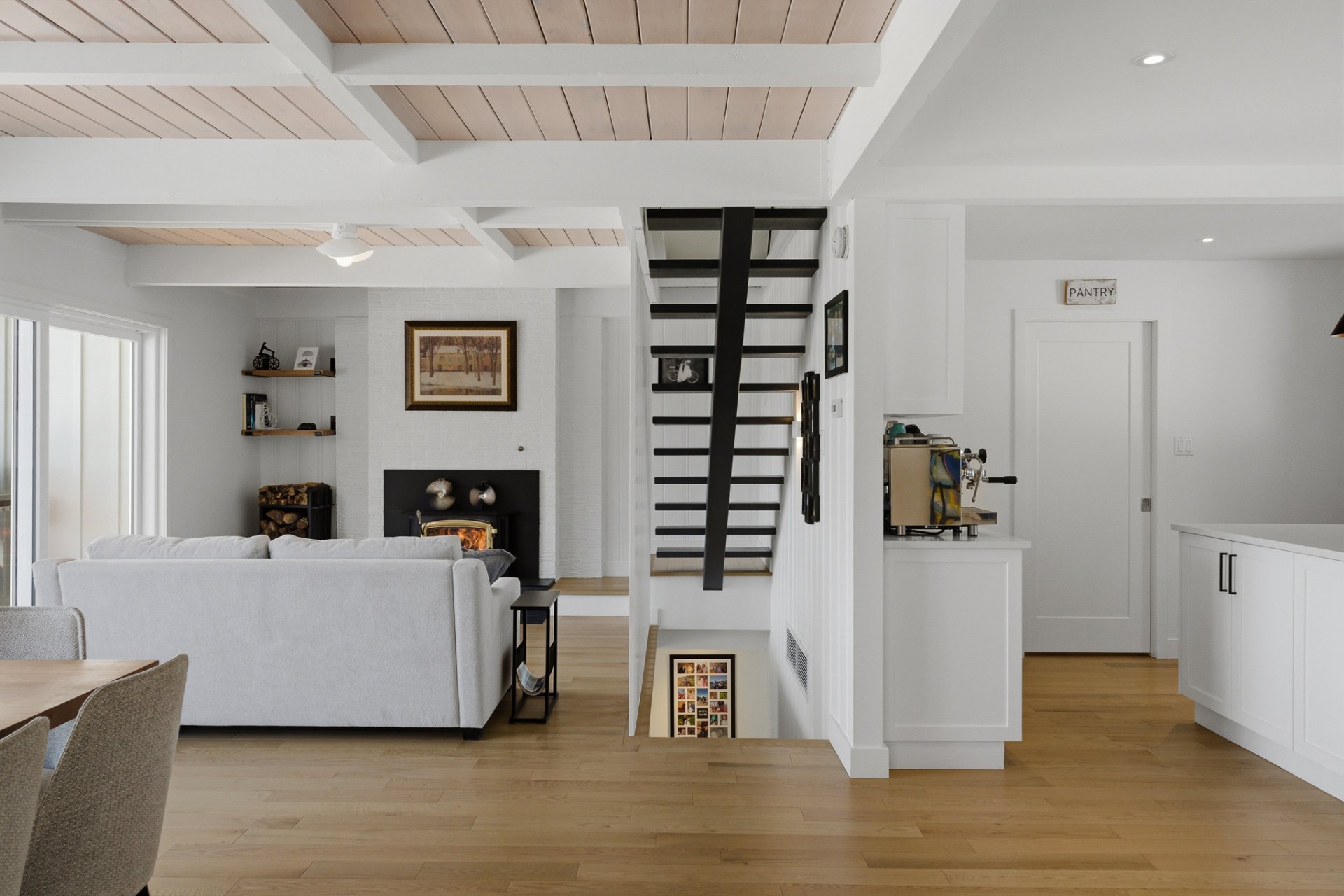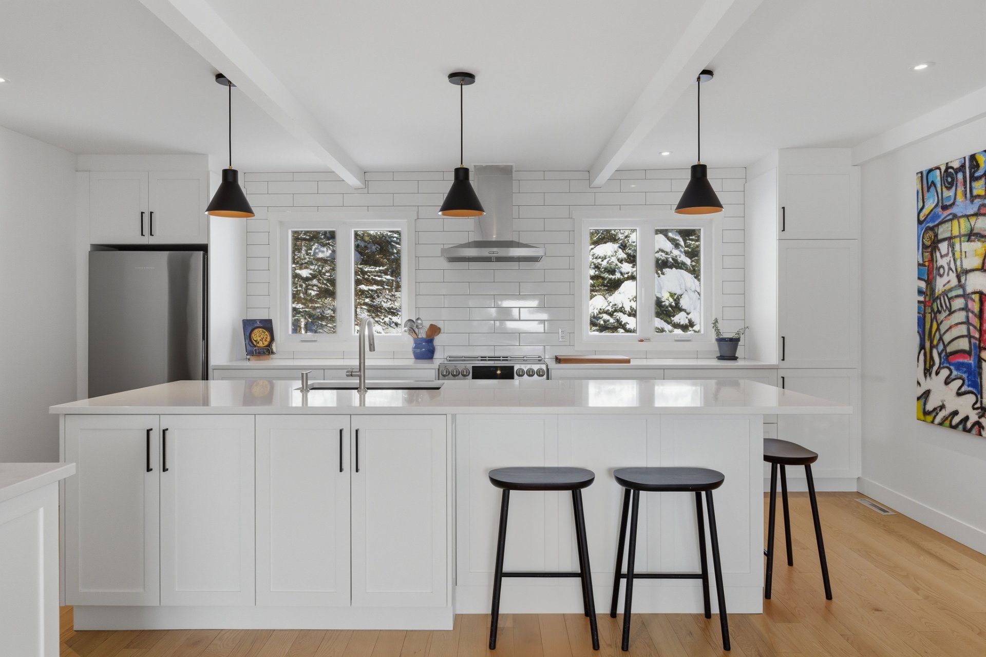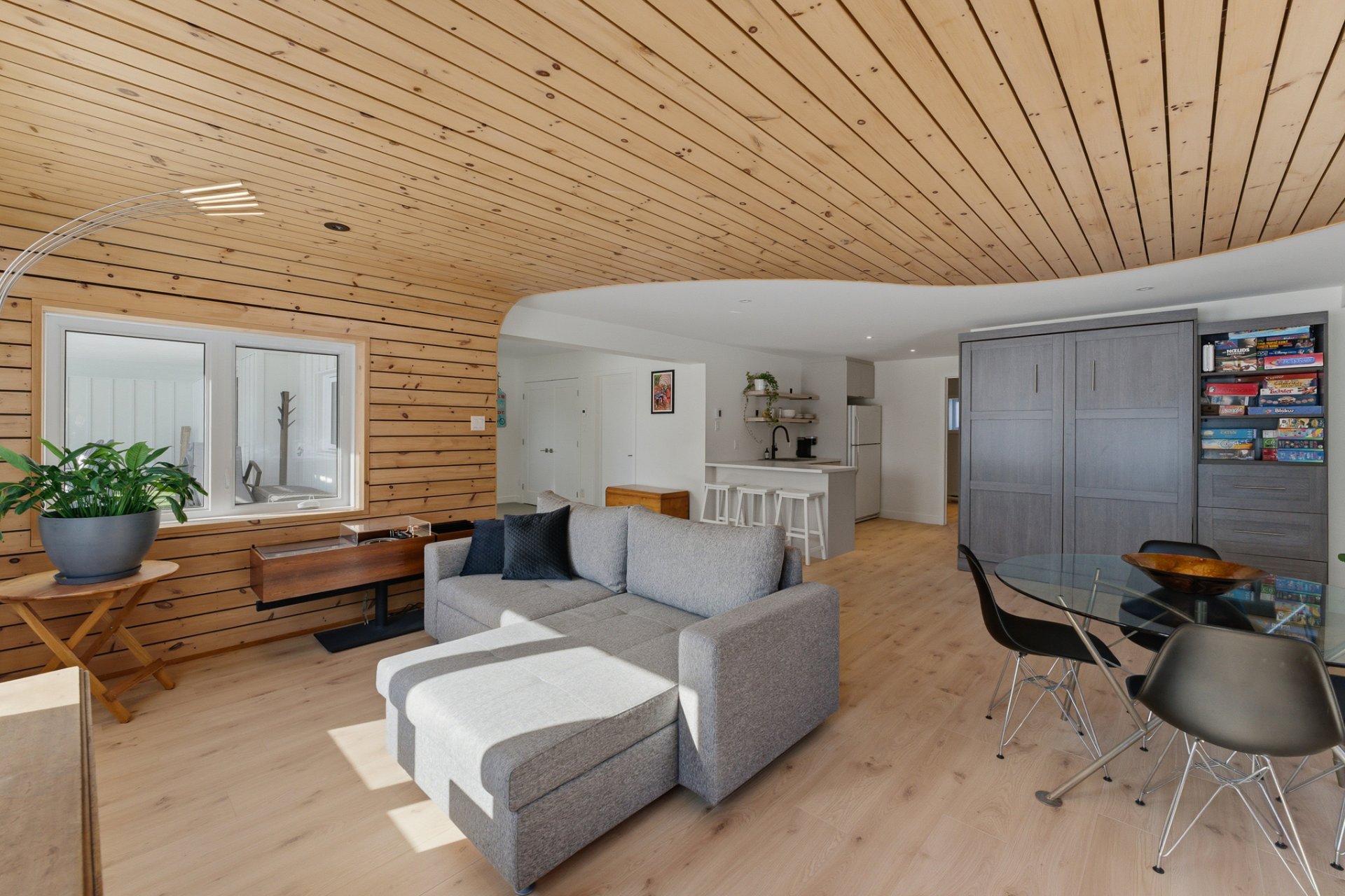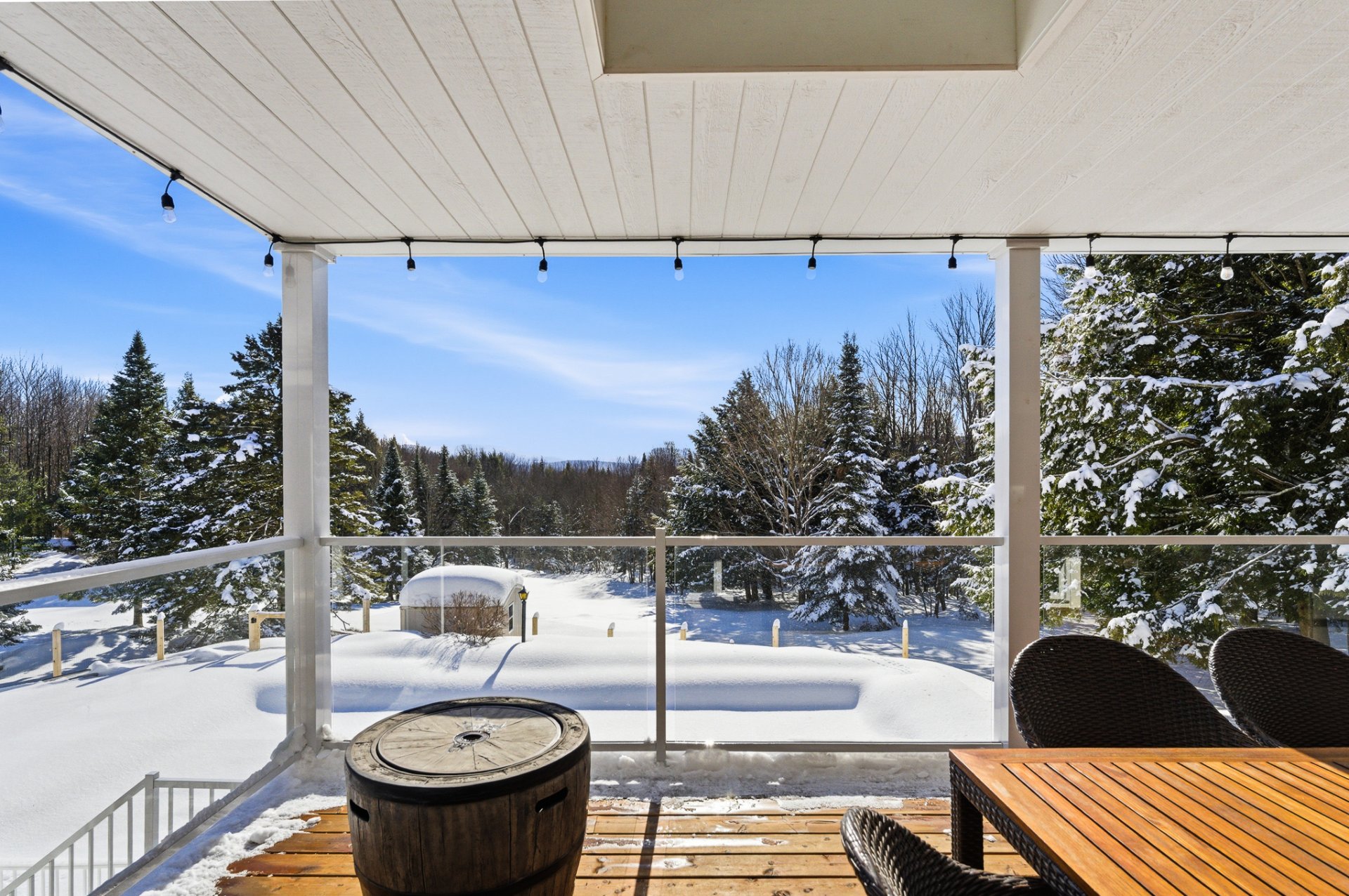 Au coeur de l'aire de vie, la cuisine séduit par son vaste îlot, son coin café et son garde-manger dissimulé avec soin qui offre un accès direct au garage. Ouverte sur la salle à manger et le salon, la lumière abonde, le paysage s'offre comme une oeuvre vivante. Le salon est réchauffé par un foyer au bois pour une ambiance feutrée en hiver tandis que la grande terrasse couverte permet de profiter de l'extérieur dans un cadre enchanteur l'été arrivé.