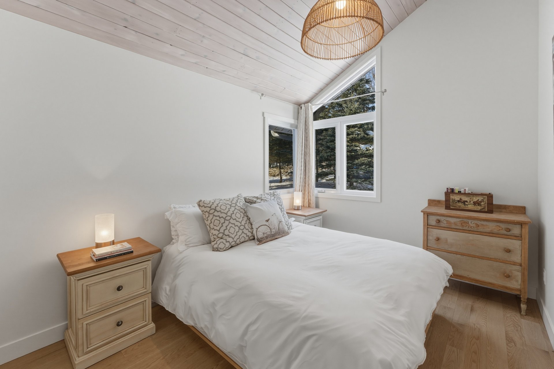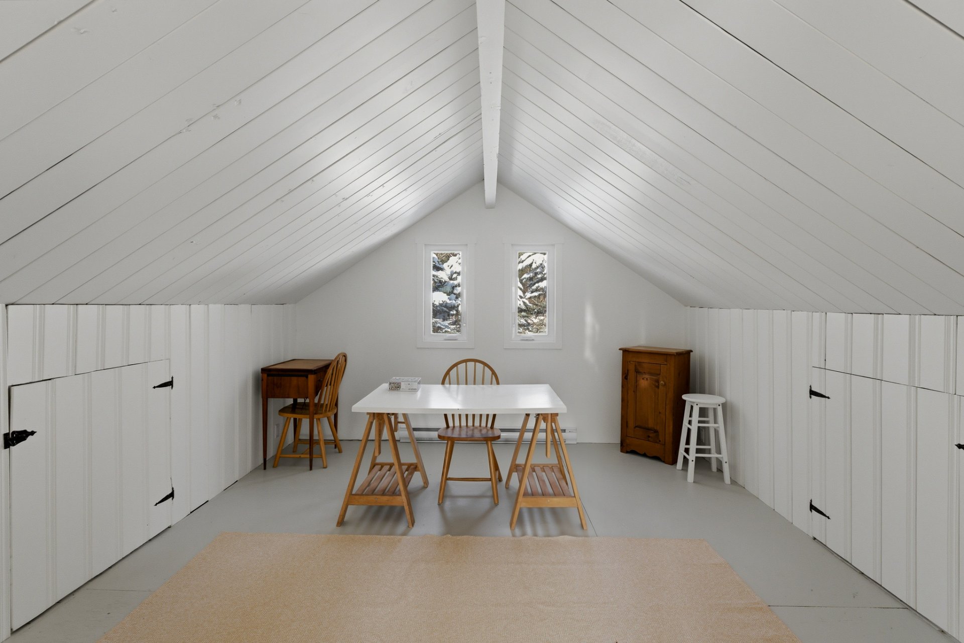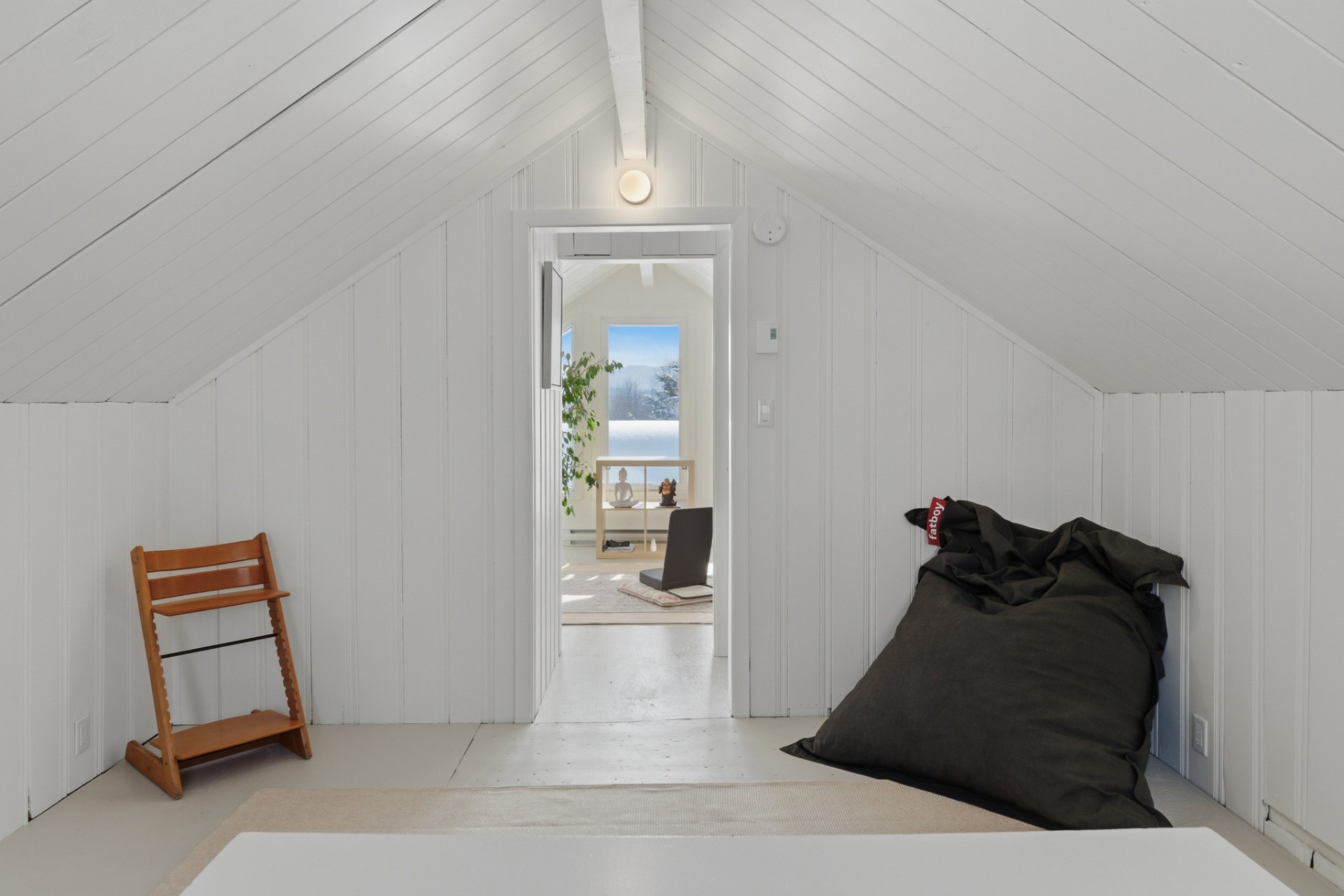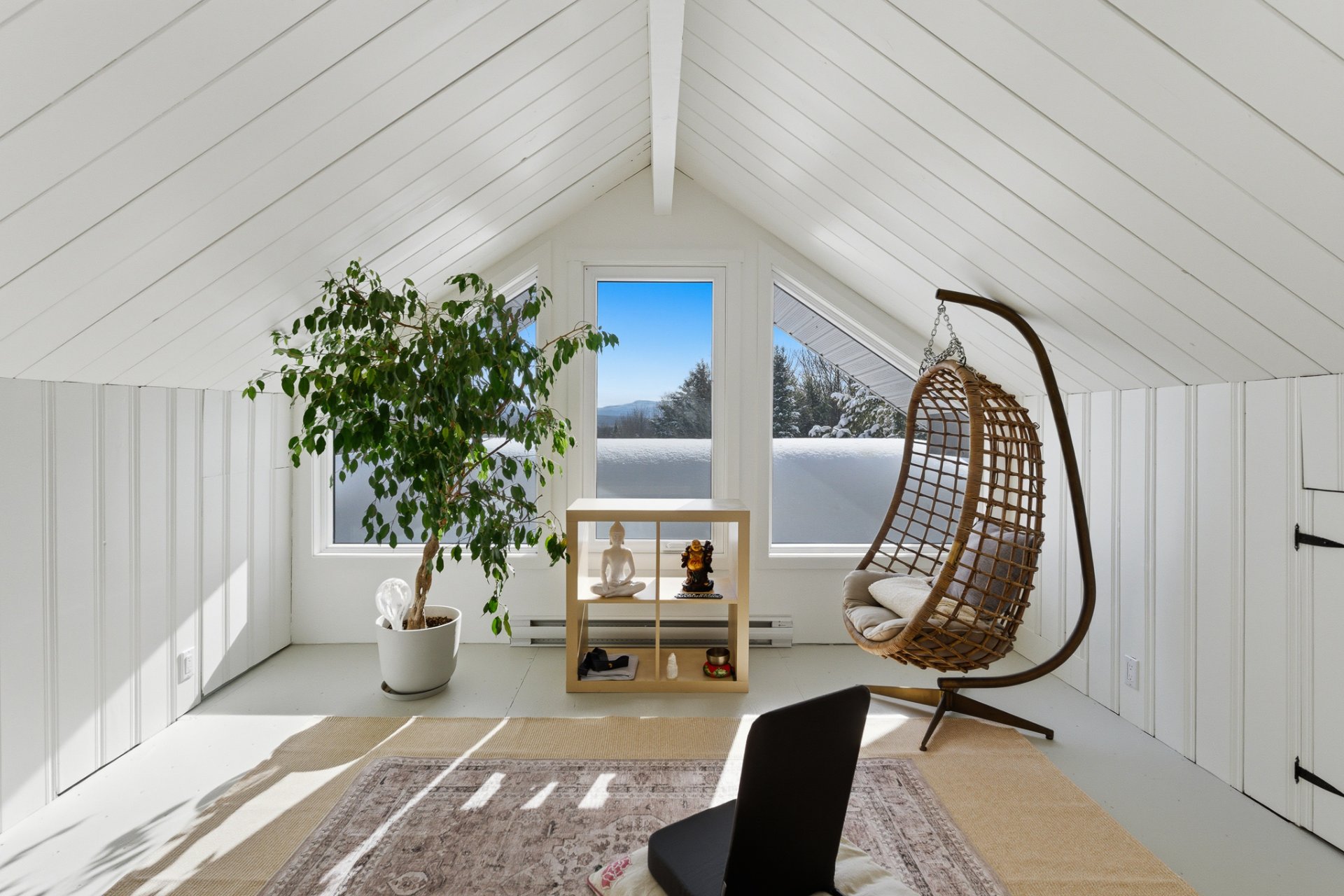 À l'étage supérieur, deux pièces mansardées offrent des espaces feutrés, que ce soit pour le yoga, un bureau ou un atelier. L'une profite aussi d'une vue spectaculaire sur les montagnes.