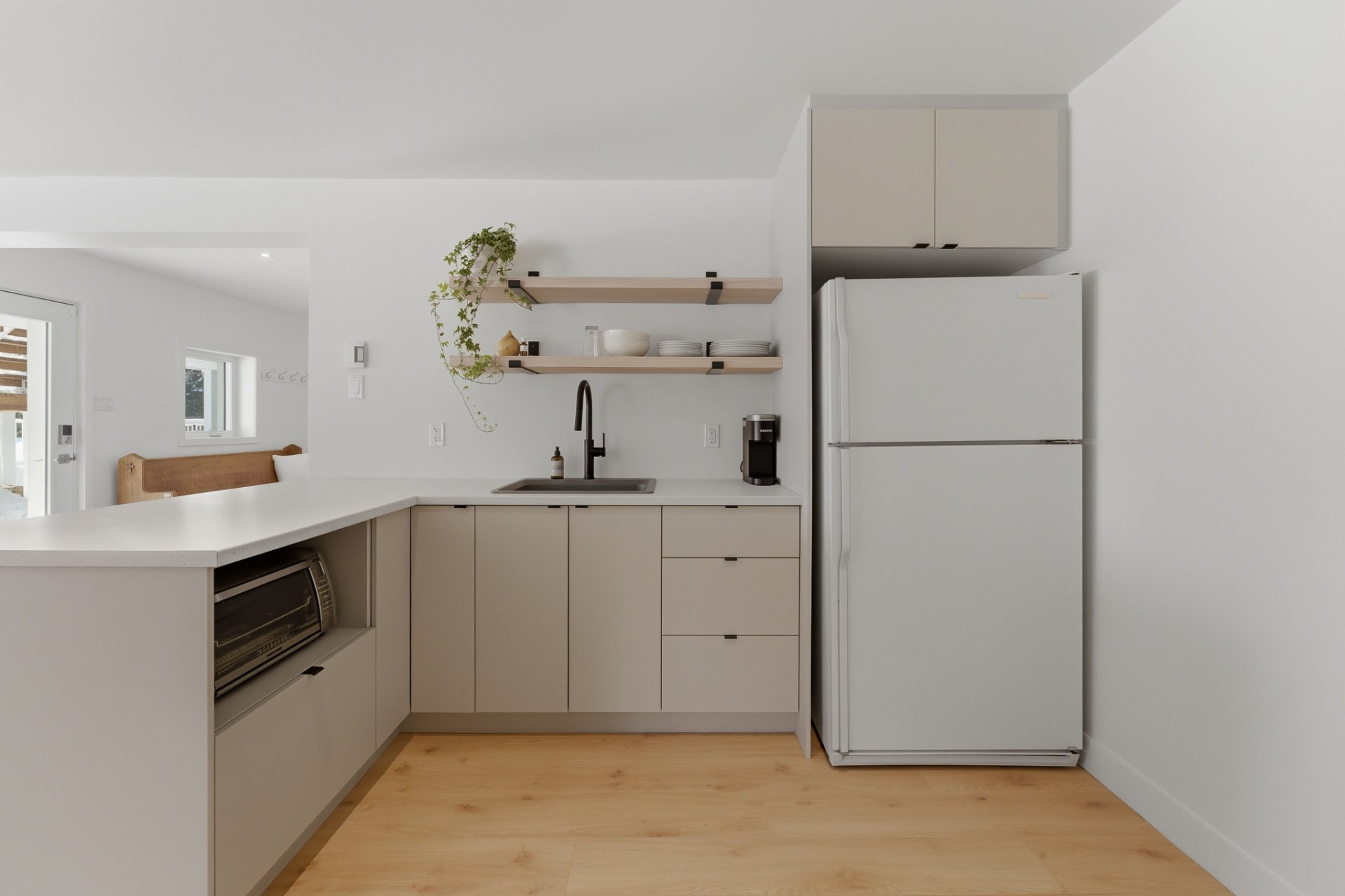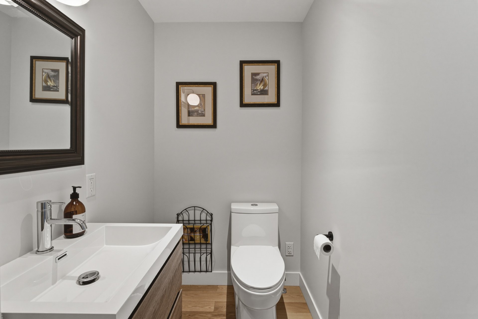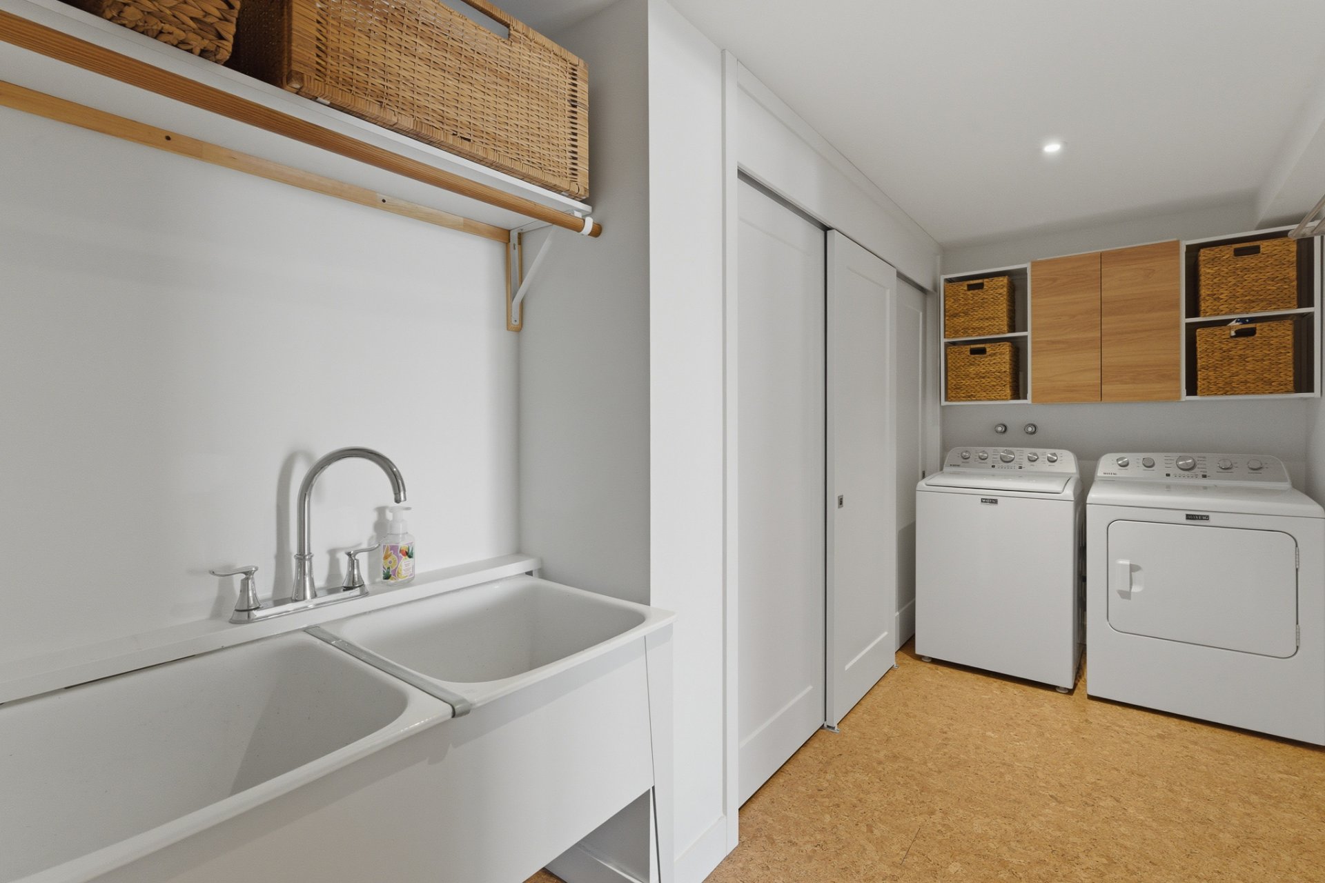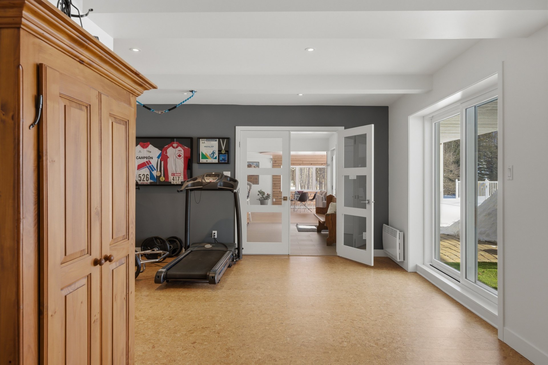 Au rez-de-jardin, se trouvent un vaste gym, la salle de lavage, une grande salle familiale aménagée d'une cuisine d'appoint, une 3ème chambre, un bureau et une salle de bains, l'endroit parfait pour accueillir famille et invités en toute intimité. Une entrée de type mudroom mène à la cour arrière.