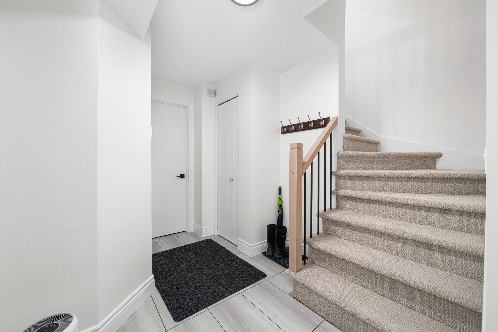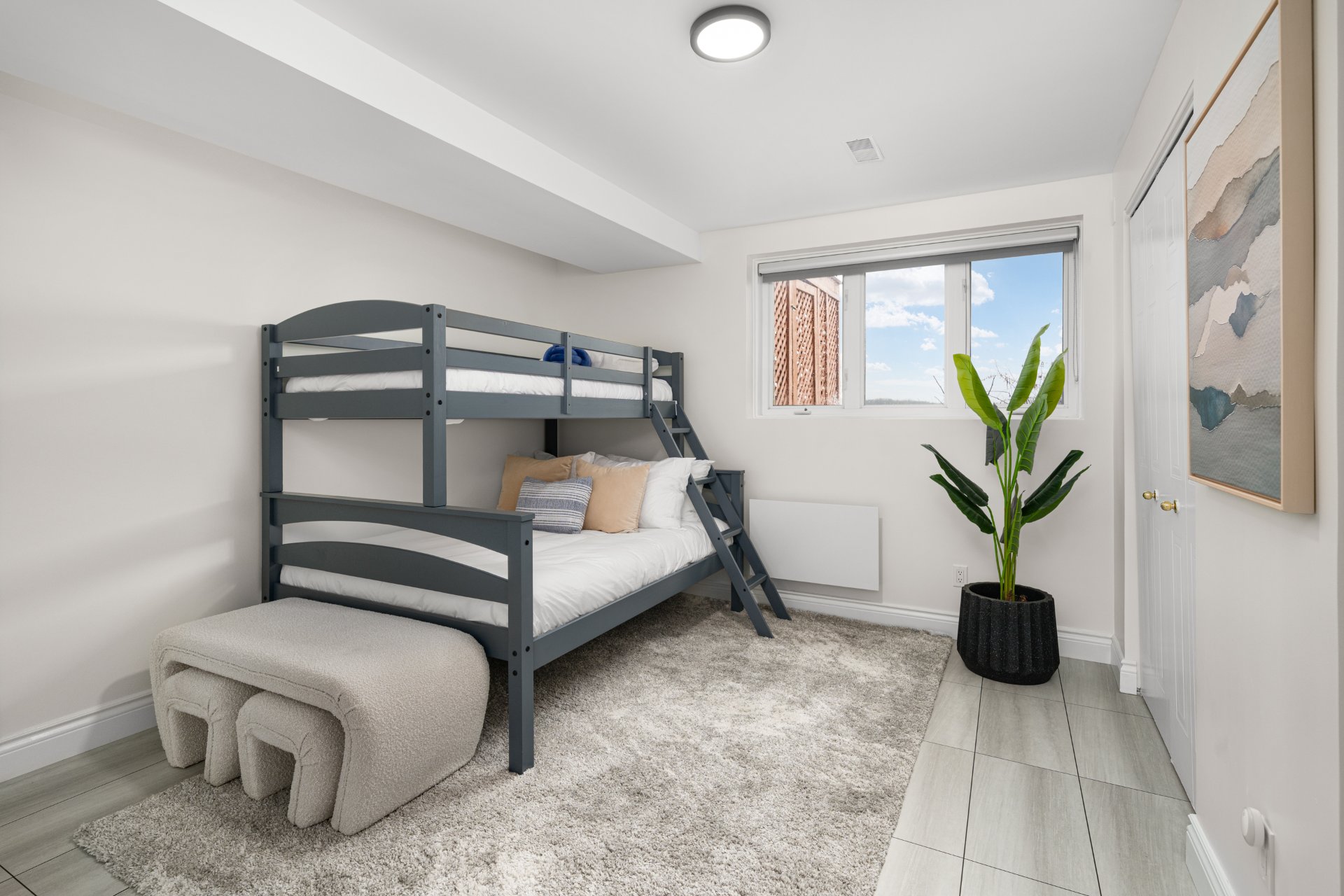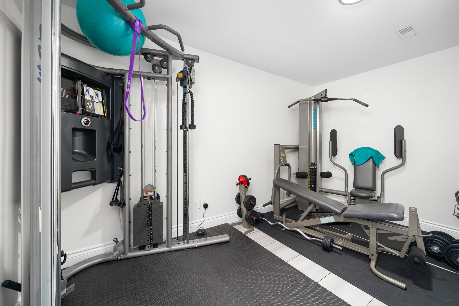 Le sous-sol comprend une troisième chambre avec salle de bains attenante, une pièce dédiée à l'exercice pouvant servir d'espace polyvalent, ainsi qu'un accès direct au garage, un espace vestibule pratique et de nombreux rangements.