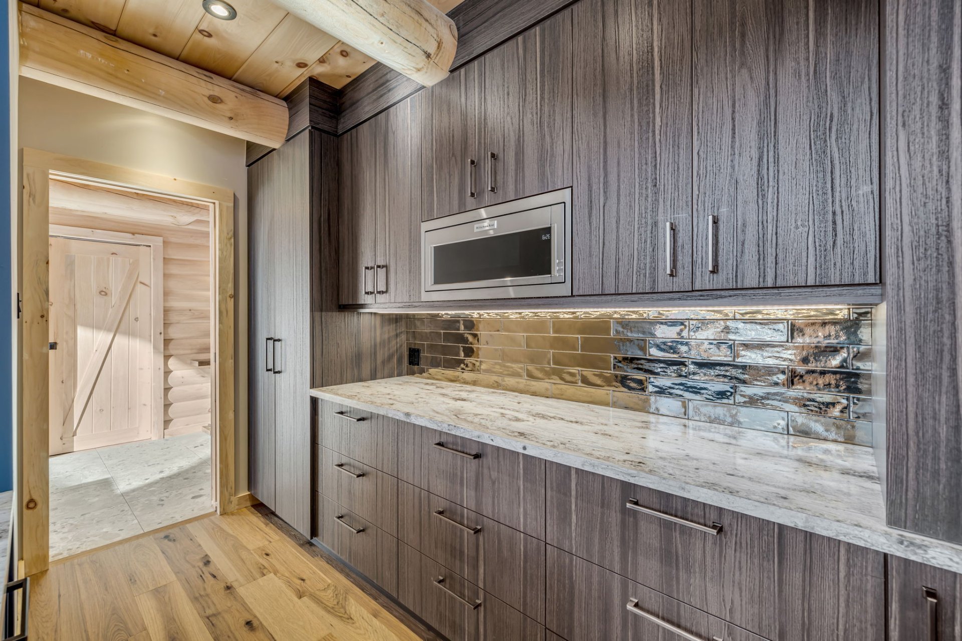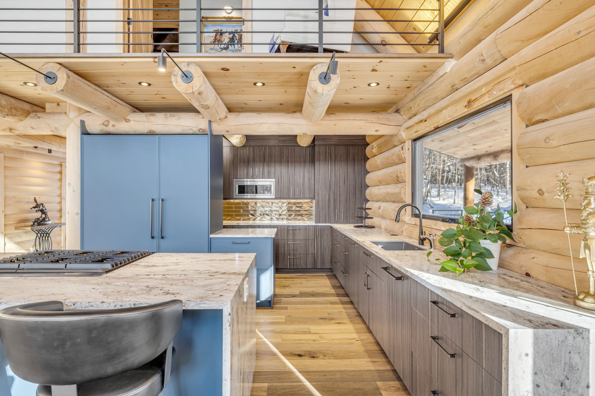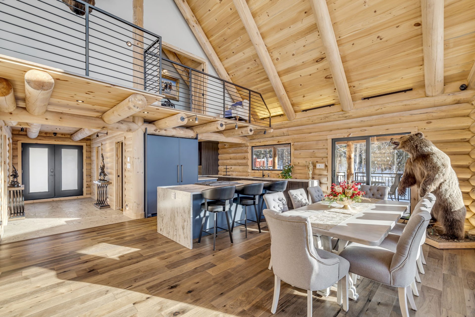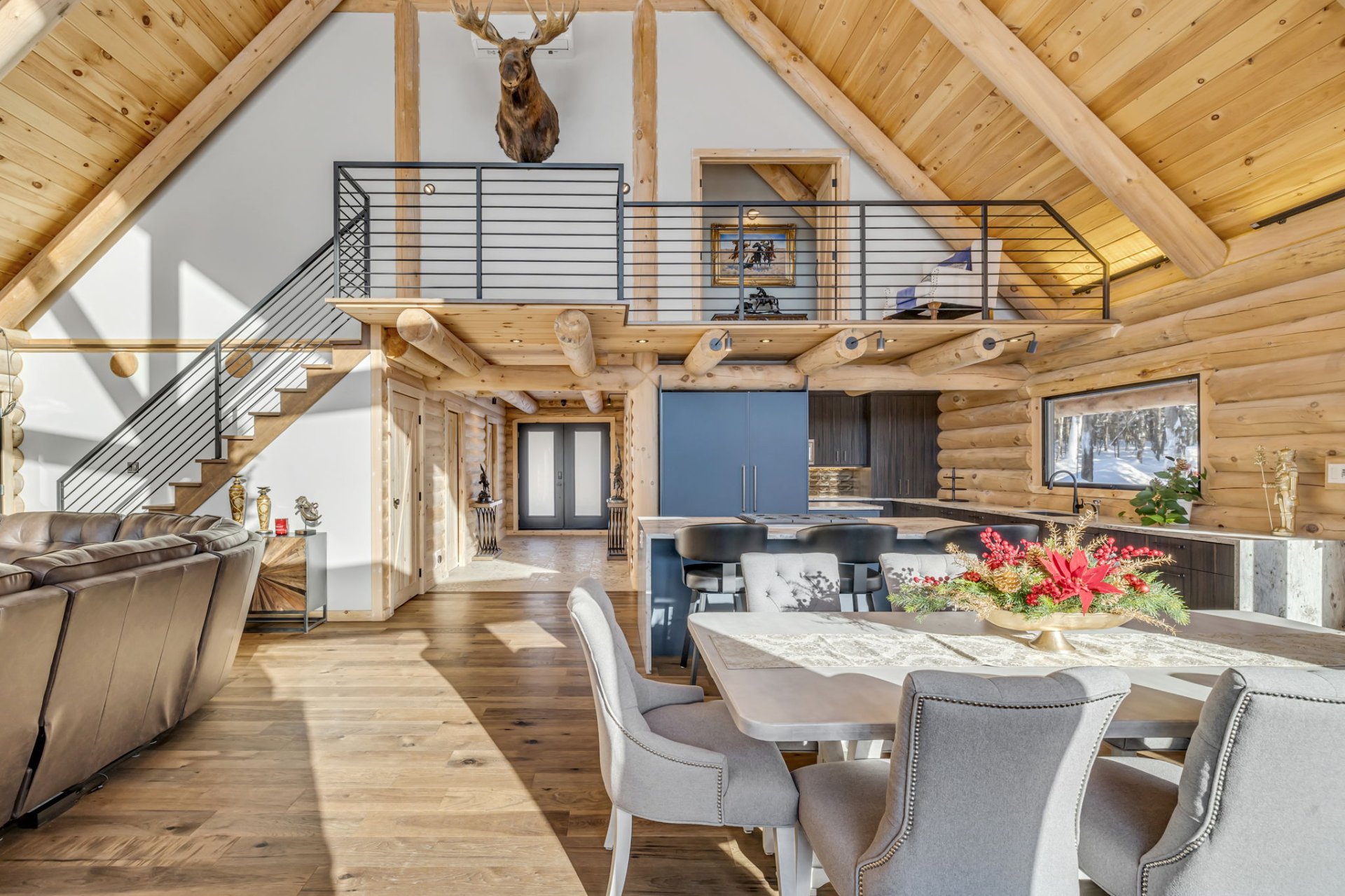 Aire ouverte (cuisine -- salle à manger -- salon) avec poutres massives