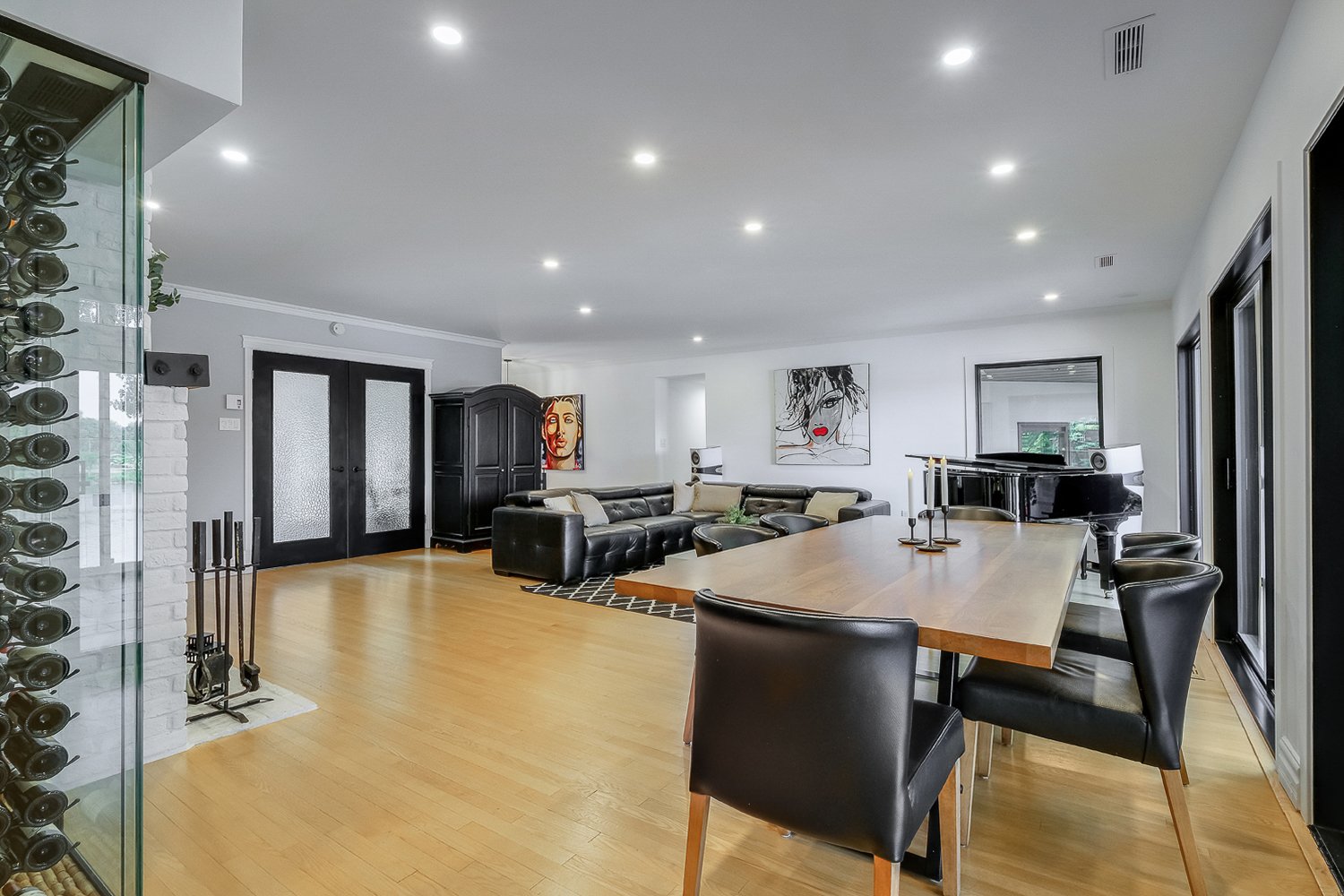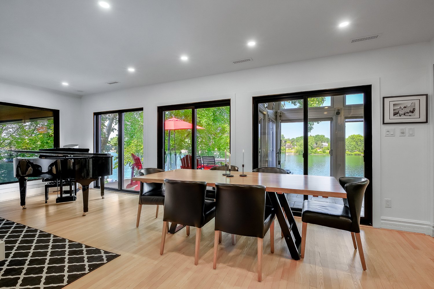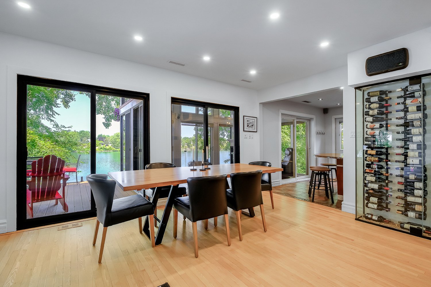 Salon spacieux, avec de grandes fenêtres donnant sur l'eau, un foyer au bois pour une ambiance chaleureuse et un cellier vitré ajoutant une touche de raffinement.