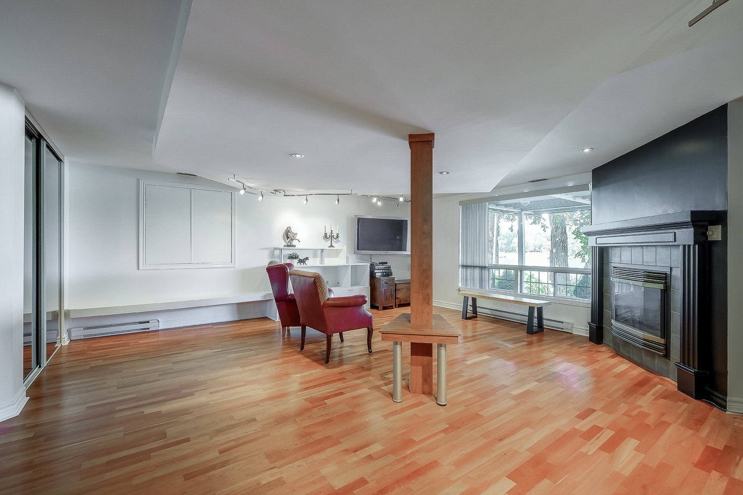 Grande salle familiale avec foyer au gaz, lumière abondante et vue spectaculaire sur la rivière. Possibilité d'aménager une quatrième chambre selon vos besoins.