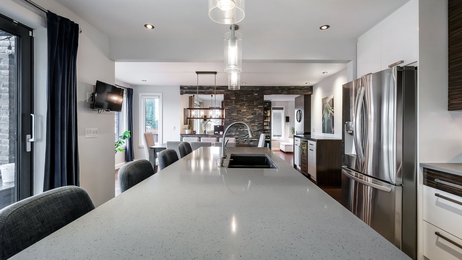 Au rez-de-chaussée, un vaste salon double, séparé par un élégant foyer trple-face, crée une ambiance chaleureuse et conviviale. La cuisine, moderne et lumineuse, se distingue par ses comptoirs en quartz, son grand îlot central avec évier et son espace lunch pratique. La salle à manger attenante, agrémentée d'un mur de pierre, offre un cadre parfait pour recevoir famille et amis. Une coquette salle d'eau complète ce niveau.