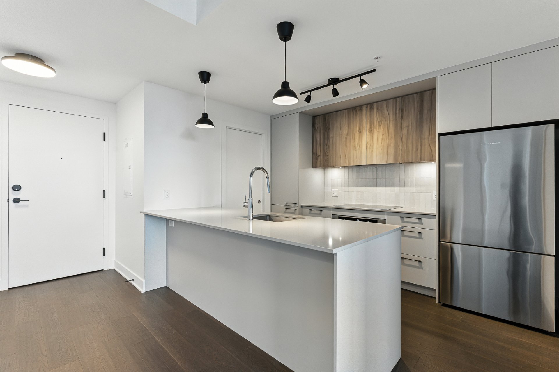 Cette unité élégante propose une cuisine moderne et fonctionnelle avec garde-manger, 2 chambres ainsi qu'une salle de bain accessible depuis l'aire de vie principale et la chambre parentale.